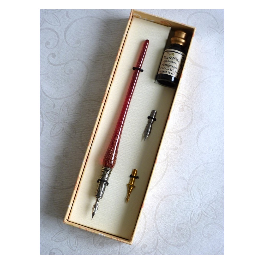 Kuparikiteet ja lasikynäsetti. Kauniisti muotoiltu, käsin viimeistelty kalligrafia-kastekynä, joka sisältää Murano Aventurine -kvartsilasikynän upotettuna kuparikiteillä. Mukana on myös kolme kärkeä ja pullo mustetta. Saatavana useina upeina väreinä.
