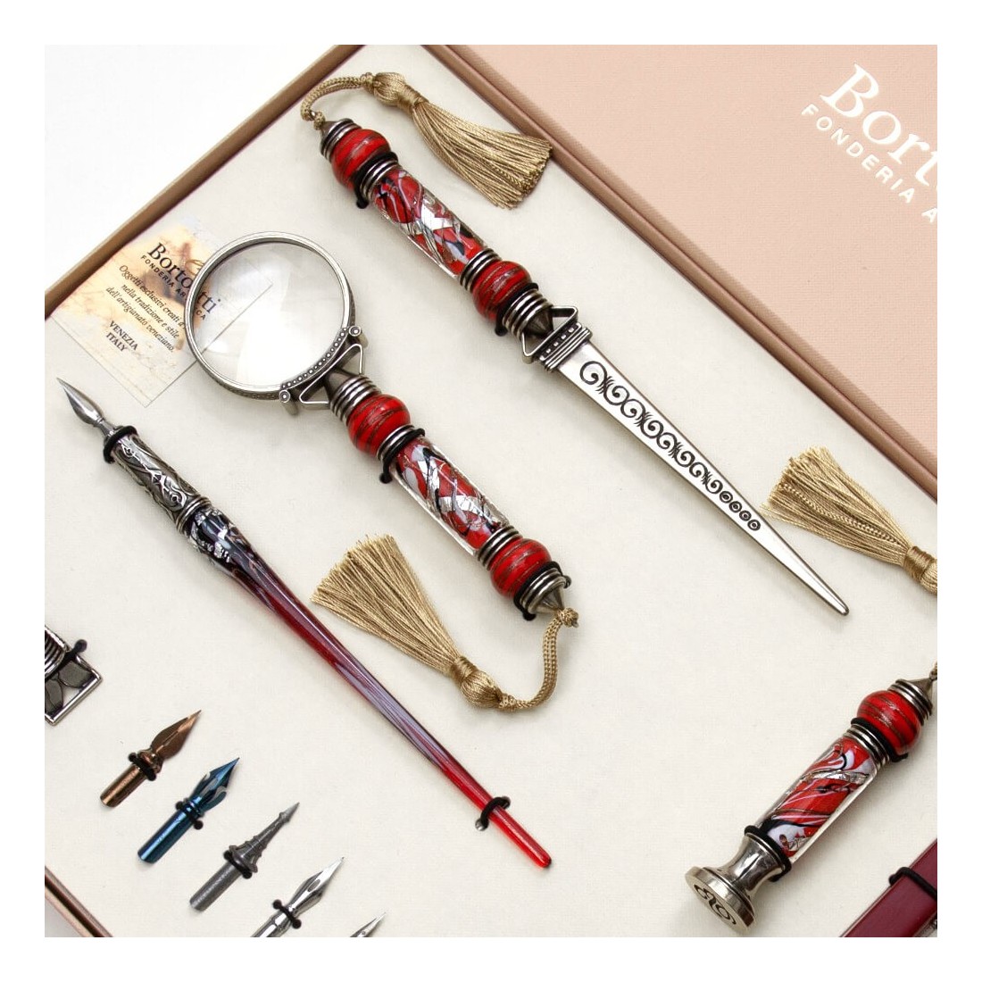 Tämä tyylikäs pöytäsetti on täydellinen kalligrafeille ja kaikille kauniita esineitä arvostaville. Sisältää Muranon lasista tehdyn kalligrafiakynän, valkoisen pronssisen kirjeenavaajan, suurennuslasin, sinetin ja erivärisiä sinettivahaa. Kaikki osat on valmistettu korkealaatuisista materiaaleista ja ne on valmistettu huolellisesti yksityiskohtiin.