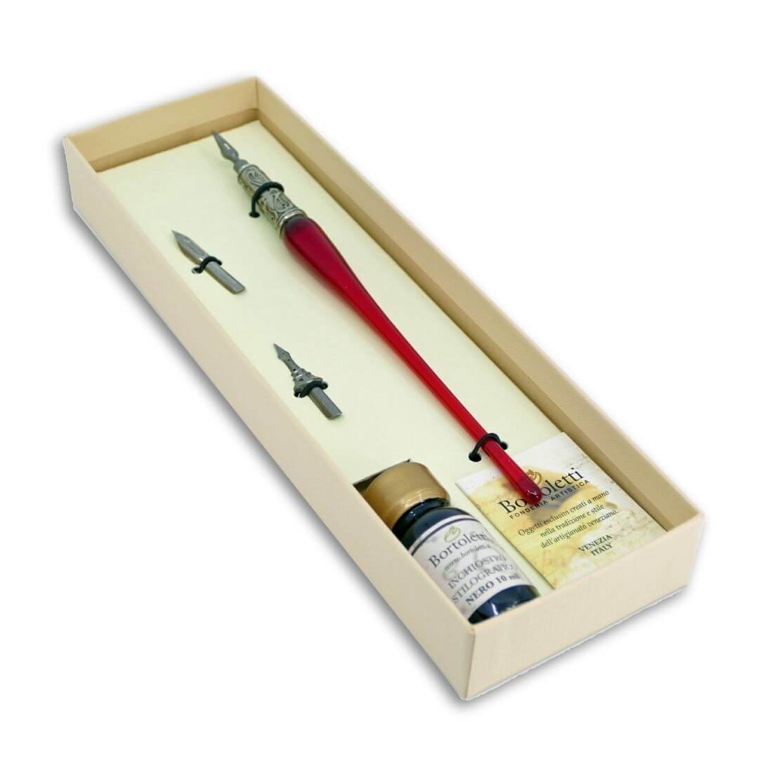 Tavallinen lasi kalligrafiakynä, valmistettu Muranon lasista ja nikkeli-hopeapinnoitetusta pronssista. Mukana kaksi ylimääräistä kärkeä ja 10 ml vesipohjaista mustetta. Valitse yhdeksästä upeasta lasiväristä.