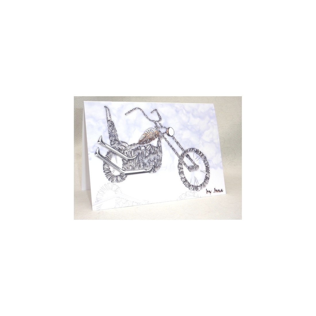 Upea "Old Skool" chopper-moottoripyörä, kaunokirjoituksen innoittama, käsin viimeistelty kortti, jossa on monia moottoripyörään liittyviä sanoja ja lauseita koko suunnittelussa. Valitse tilaisuus tai käytä Lisävarusteet-välilehteä ja mukauta se nimellä, iällä ja tilaisuudella. Upea syntymäpäiväkorttina bikerille elämässäsi! Tässä upeassa käsintehdyssä kortissa on halkaisijat ohjaustangon molempiin päihin.