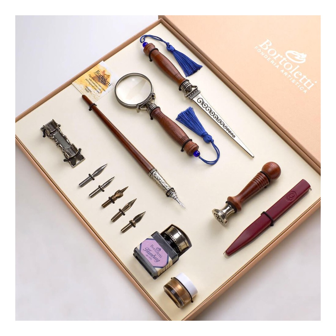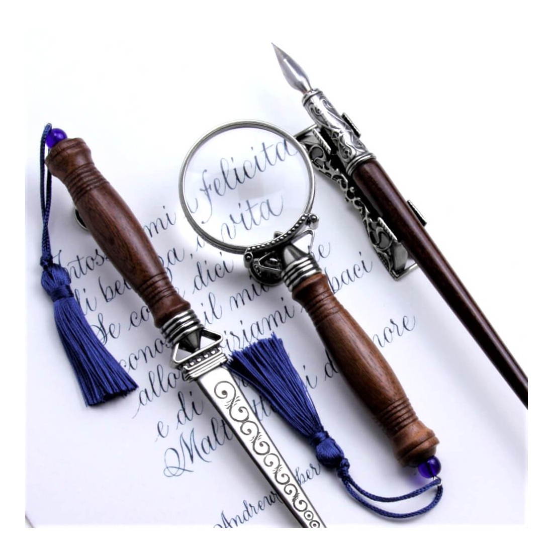 Kalligrafia kynä on sarjan kohokohta. Se on valmistettu pyökkimästä ja on kaunis, vintage nib. Kynä on erittäin mukava pitää ja kirjoittaa, ja se tuottaa kauniita, virtaavia viivoja. Kirjeen avaaja on myös valmistettu pyökkipuusta ja siinä on terävä, terävä terä. Se on täydellinen kirjainten ja pakettien avaamiseen. Suurennuslasi on valmistettu valkoisesta pronssista ja siinä on suuri, selkeä linssi. Se sopii erinomaisesti pienten tulosteiden lukemiseen tai läheiseen työhön. Tiiviste on valmistettu valkoisesta pronssista ja siinä on kaunis, monimutkainen muotoilu. Se on täydellinen kirjeiden ja asiakirjojen tiivistämiseen. Tiivistysvaha tulee erilaisiin väreihin. Se sopii erinomaisesti eleganssin kosketukseen kirjaimiin ja asiakirjoihin.