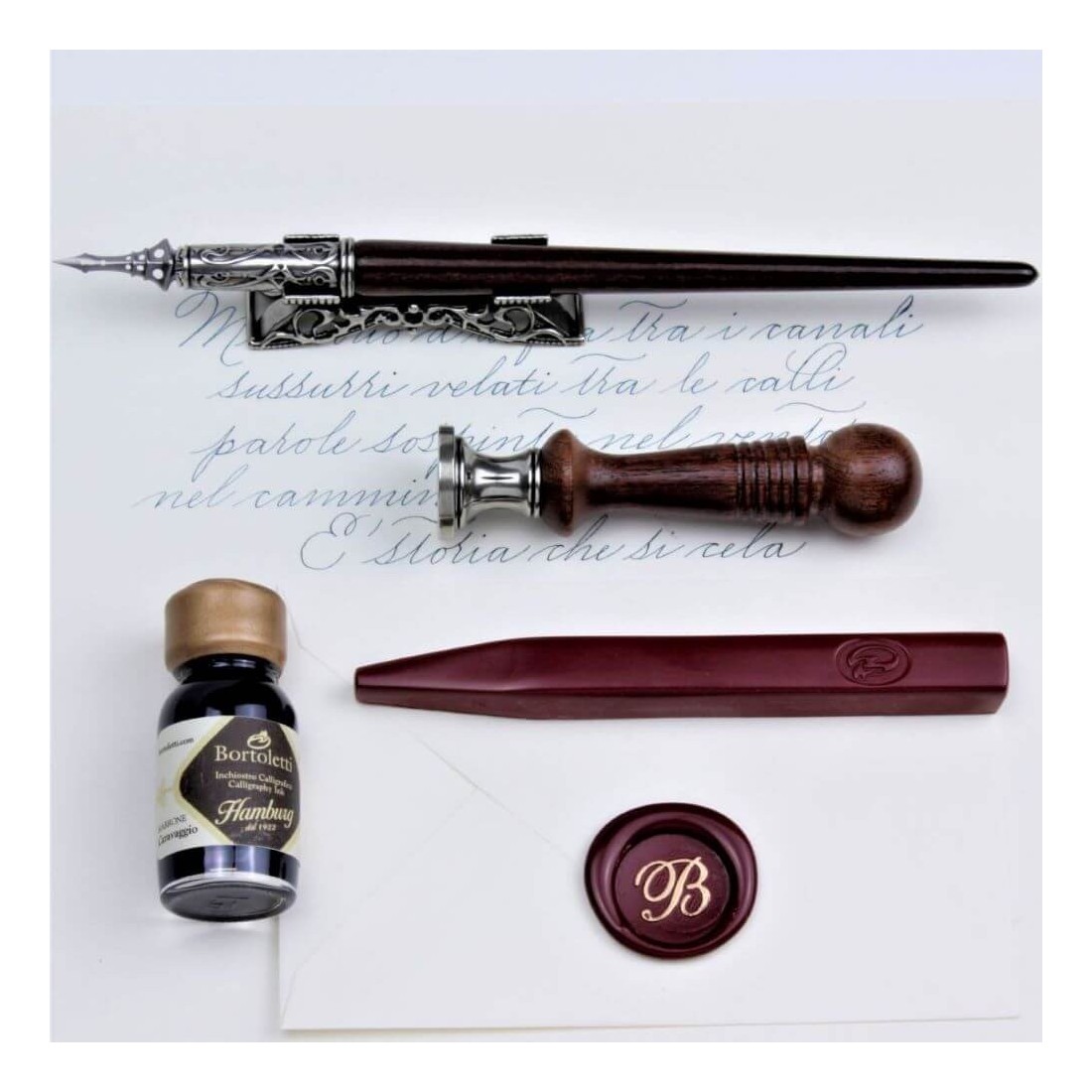 Cimaroli-kalligrafiasarja on yksi Bortoletti-kokoelman lippulaivoista, ja on helppo ymmärtää miksi. Kynä on valmistettu korkealaatuisesta puusta ja kynäteline käsin työstetystä valkoisesta pronssista. Sinetti on myös valmistettu puusta, ja siinä on laaja valikoima vaihdettavia kirjaimia ja symboleja.
