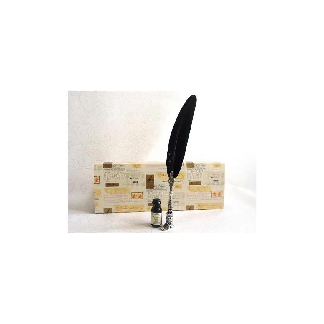 Paranna kirjoitustyyliäsi toisella koristeellisella tina-kalligrafiakynäsarjalla. Tämä on musta hanhen sulka, jossa on tina. Mukana kenkätyylinen kynänpidike ja pullo mustaa mustetta. Valmistettu Italiassa La Kaligrafica.