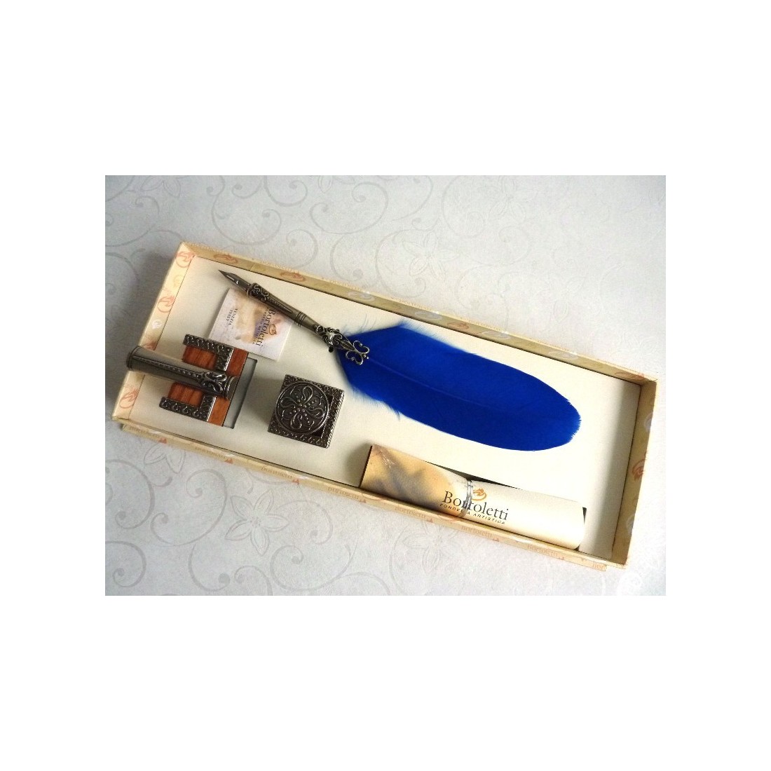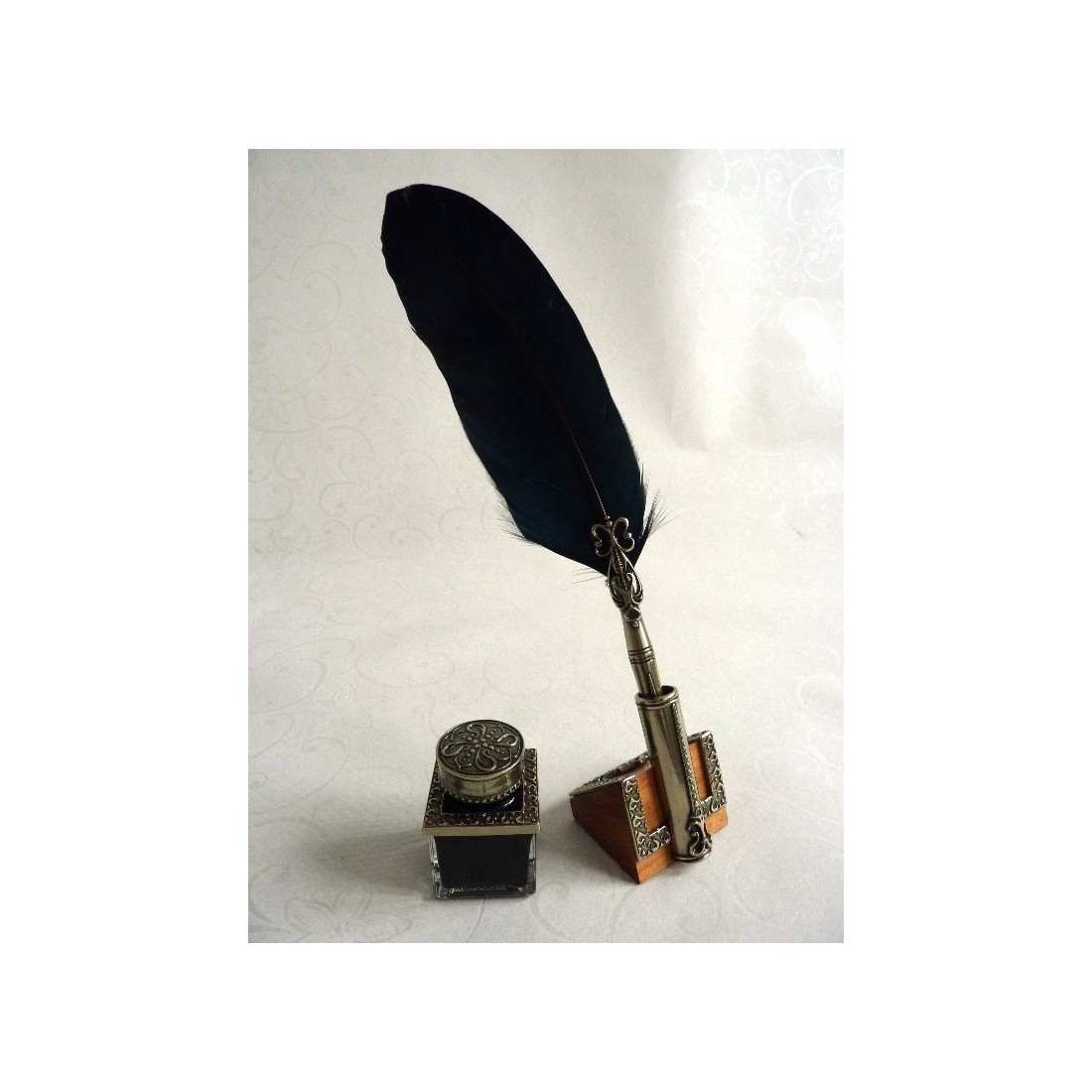 Höyhenpeite, mustepatruuna ja kynäteline. Tämä sarja sisältää hanhen sulka-kalligrafiakynän, jossa on pronssikärkipidike päällystetty nikkeli-hopealla, mustesäiliö ja kynänpidike, pergamentti, jolla on kirjoittamisen historia, ja kynänpidike. Nikkeli-hopeakoriste rikastuttaa höyhenkynää, mustekasettia ja kynänpidikettä. Tyylikäs lahjaideo. Ihanteellinen ajatusten kirjoittamiseen tyylikkäästi.