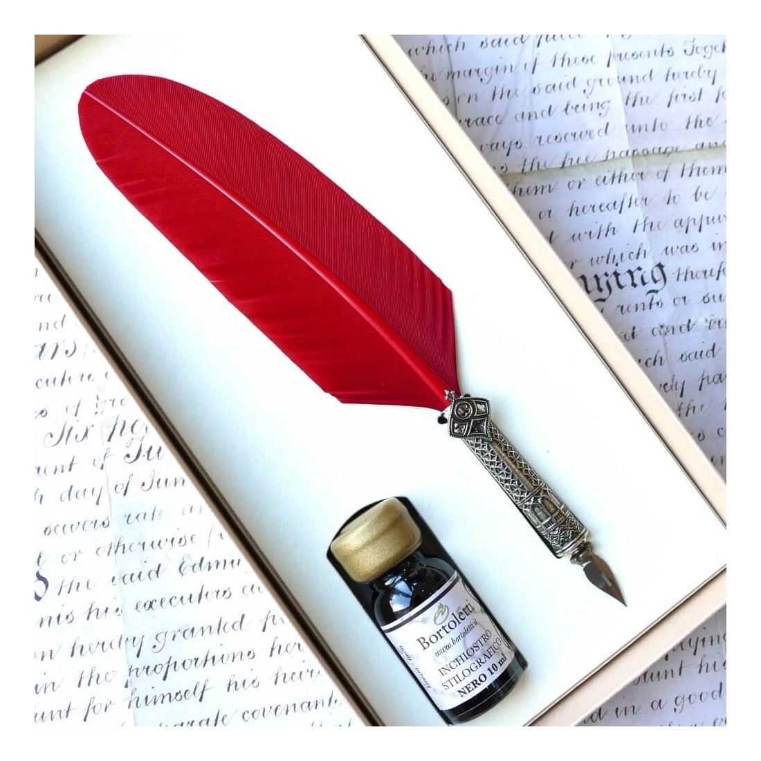 Hanhi höyhen kalligrafia kynä ja muste. Tämä sarja käsittää hanhi sulka kalligrafiakynän pronssi kärki haltija päällystetty nikkelin hopeaa ja standardi pullo mustetta. Valmistettu Italiassa Bortoletti Fonderia Artistica.