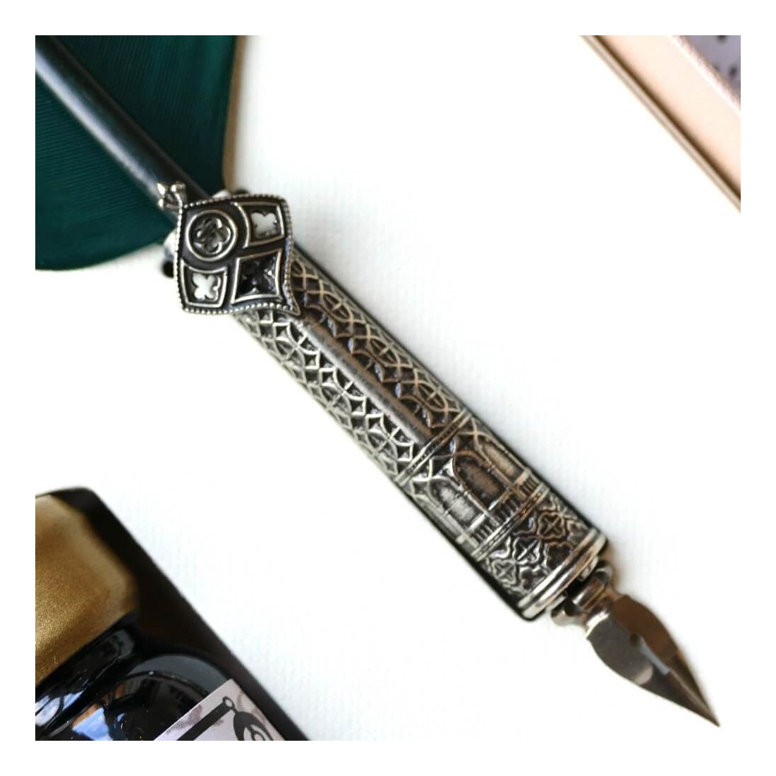 Hanhi höyhen kalligrafia kynä ja muste. Tämä sarja käsittää hanhi sulka kalligrafiakynän pronssi kärki haltija päällystetty nikkelin hopeaa ja standardi pullo mustetta. Nikkeli hopea koristelu rikastaa kynää. Tyylikäs lahjaidea.