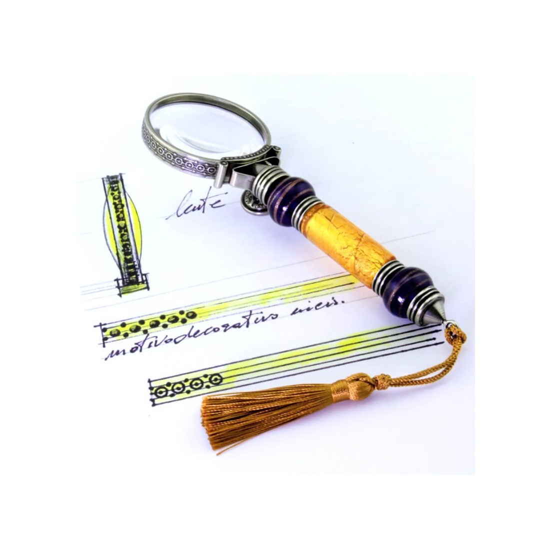 Suurennuslasi arvokkaalla 24 karaatin kultalehdellä, joka on sulatettu Muranon lasiin, elegantti lahja. Ainutlaatuinen pronssista ja Muranon lasista valmistettu suurennuslasi, jonka ovat valmistaneet Bortolettin lasinvalmistajat työpajassaan. Tyylikäs ja arvokas lisä työpöytääsi muotoilulla, joka ei koskaan mene pois muodista ja joka on suunniteltu lisäämään pöytäsi tyylikkyyttä.