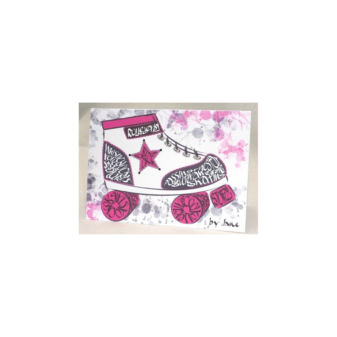 Une carte de patin à roulettes unique finie à la main. Conçu en utilisant la calligraphie dans des mots et des phrases qui reflètent la scène du roller derby. Des paillettes dans les œillets et des diamants autour de l'étoile font briller cette magnifique carte. Disponible dans les tons de rose ou de rouge.