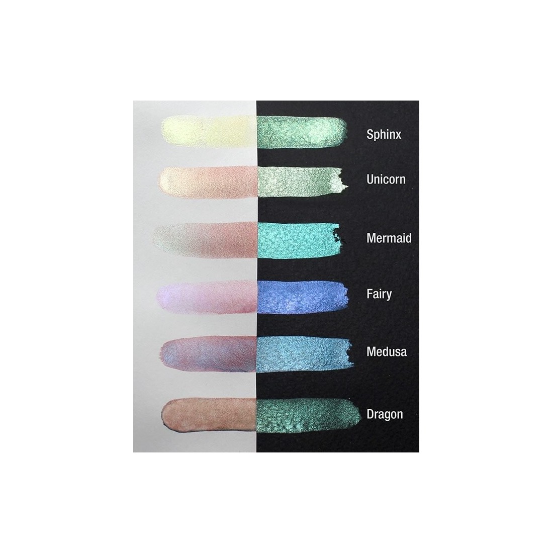 Le remplissage Unicorn Pearlcolor, fait à la main en Allemagne, offre une lueur iridescente magique. Comprend des emballages étiquetés pour une utilisation dans une boîte à palettes en métal.