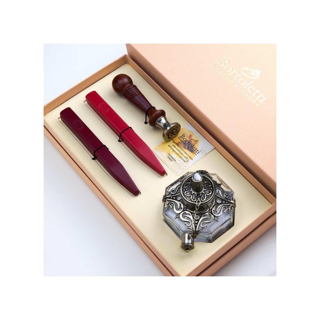 Le sceau de cire Rialto est un produit artisanal de haute qualité qui vous permet de créer de beaux sceaux de cire durables. L'ensemble comprend un sceau en bois, deux barres de cire et un réchaud à alcool pour faire fondre la cire.