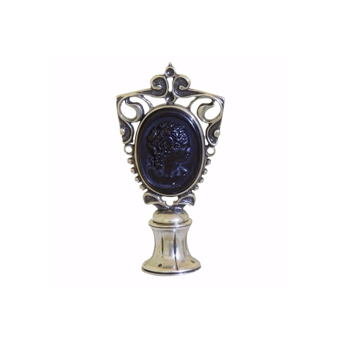 Ensemble de sceau en cire composé d'un sceau en bronze et d'un camée en verre représentant une femme. Un sceau, un bâton de cire à cacheter et un pot de crème de cire. Le joint et la poignée sont finis en nickel-argent.
