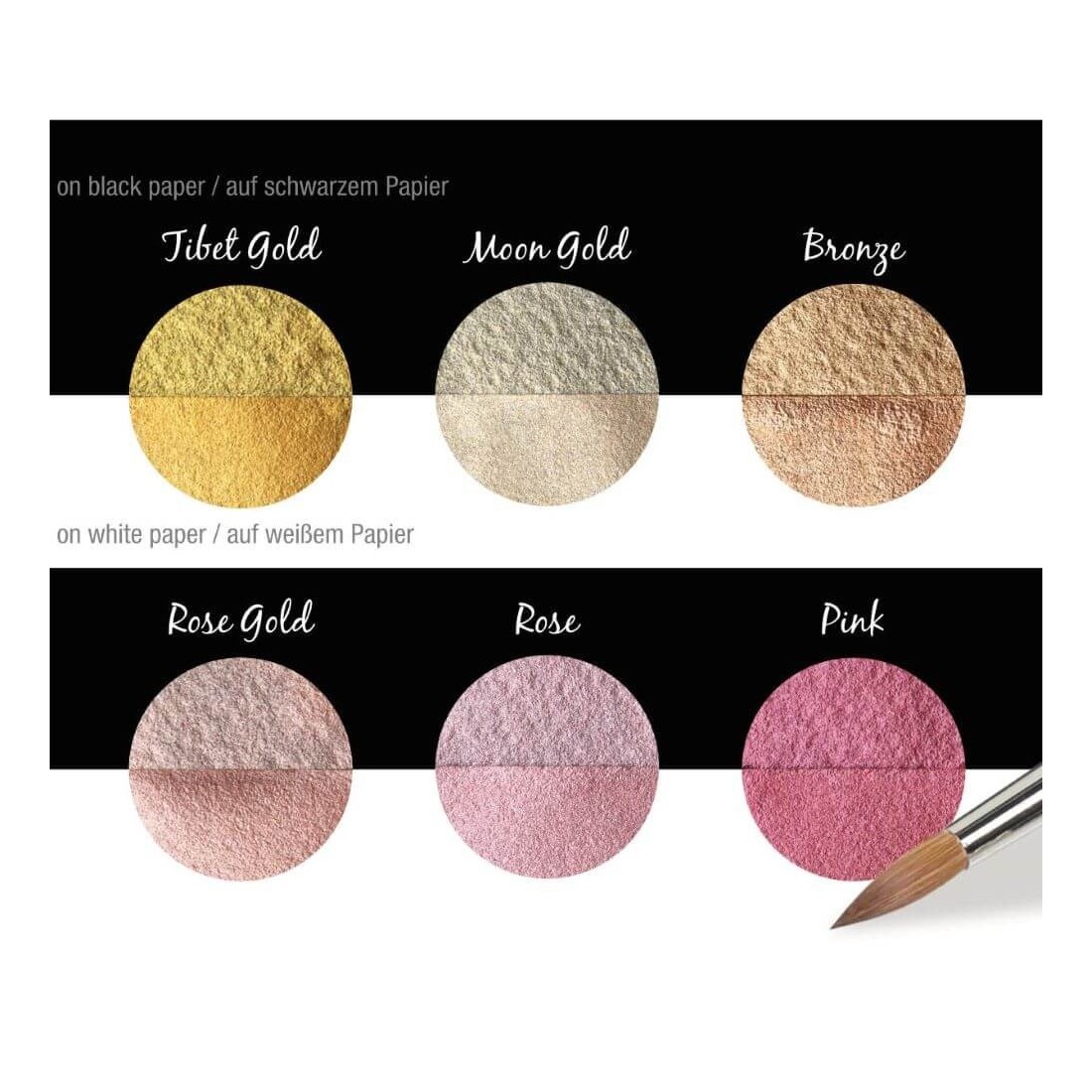 Fabriqué en mica, un minéral naturel qui offre une grande variété de nuances métalliques, de l'or et de l'argent aux couleurs de perles irescentes et brillantes. Activez avec une petite eau sur la palette et appliquez-la à la pointe avec une brosse. Adhère à toutes les surfaces absorbantes, telles que le papier, le bois, le gypse, etc.