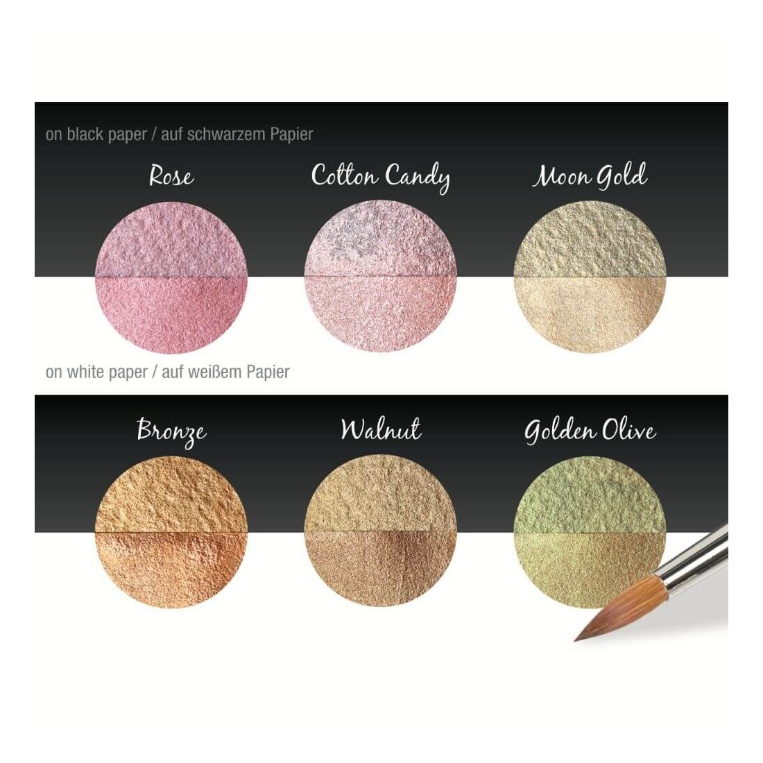 Fabriqué en mica, un minéral naturel qui offre une grande variété de nuances métalliques, de l'or et de l'argent aux couleurs de perles irescentes et brillantes. Activez avec une petite eau sur la palette et appliquez-la à la pointe avec une brosse. Adhère à toutes les surfaces absorbantes, telles que le papier, le bois, le gypse, etc.