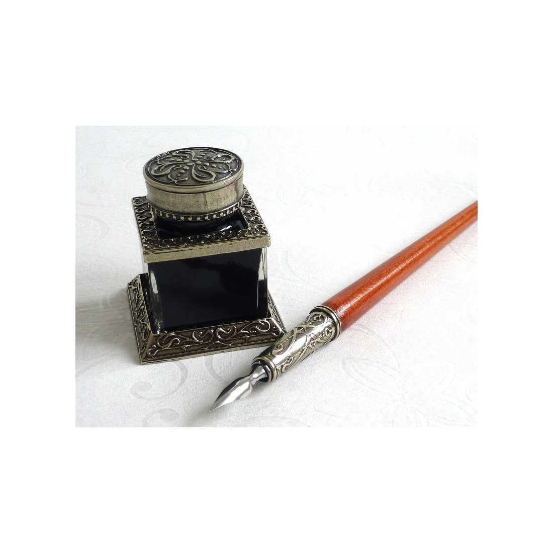 Stylo plume en bois, encrier et porte-stylo. Cet ensemble se compose d'un stylo en bois avec un porte-plume en bronze plaqué en argent nickel et un encrier. Nickel argent et bois avec goût et simplicité. La décoration argent nickel enrichit le stylo en bois, l'encrier et le porte-stylo. Un bureau essentiel avec stylo, encrier et porte-stylo.