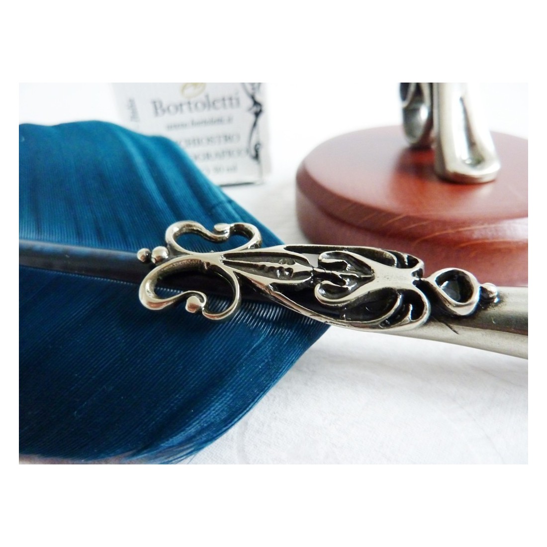 Stylo plume de calligraphie, cinq pointes et un porte-stylo. Cet ensemble comprend un stylo de calligraphie en plume d'oie avec un porte-plume en bronze plaqué argent nickel, une grande bouteille d'encre, un porte-stylo clé de sol et cinq pointes anciennes. Fabriqué en Italie par Bortoletti Fonderia Artistica.