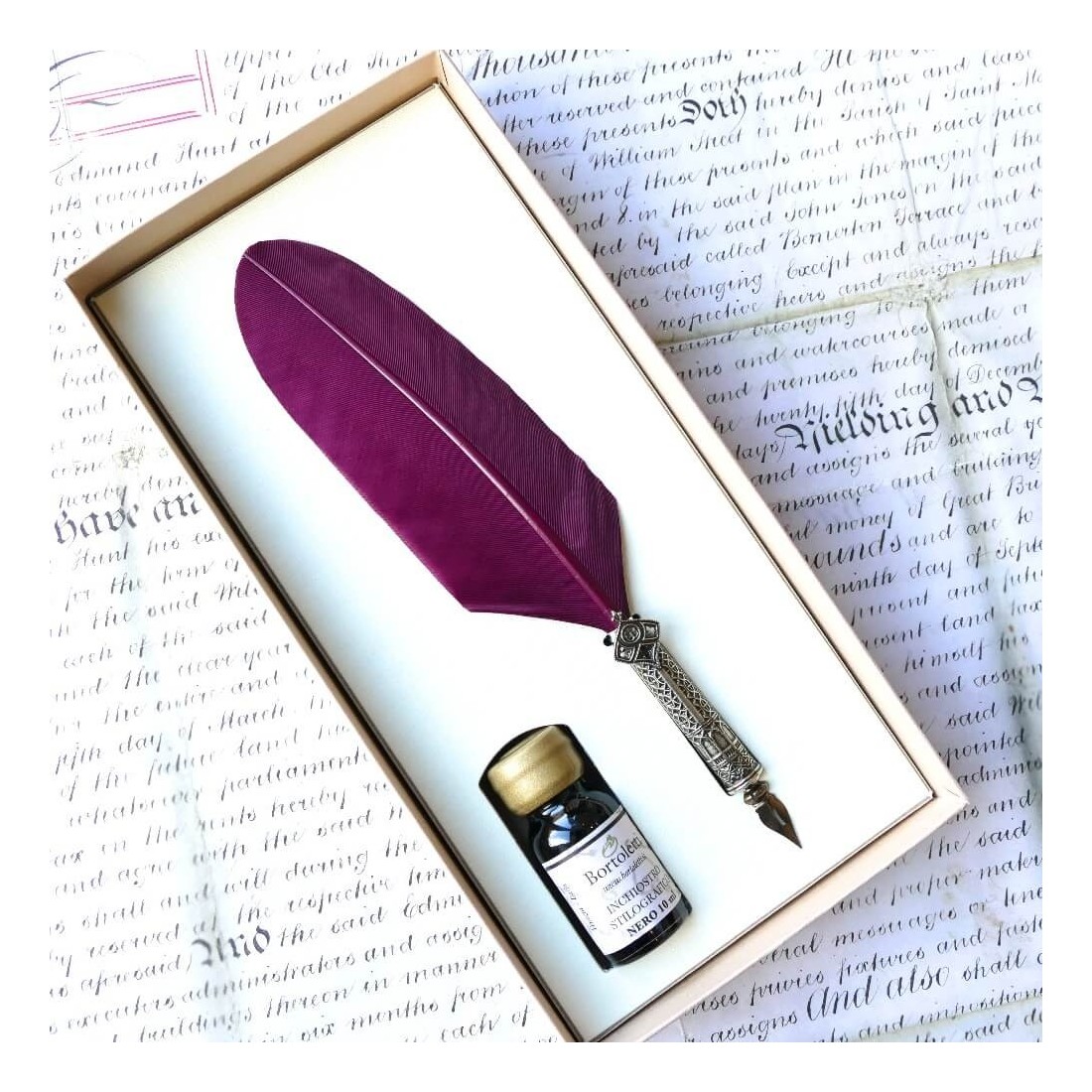 Stylo et encre de calligraphie en plumes. Cet ensemble comprend un stylo à plume de calligraphie avec un porte-bec en bronze plaqué en argent nickel et une bouteille standard d'encre. Fabriqué en Italie par Bortoletti Fonderia Artistica.
