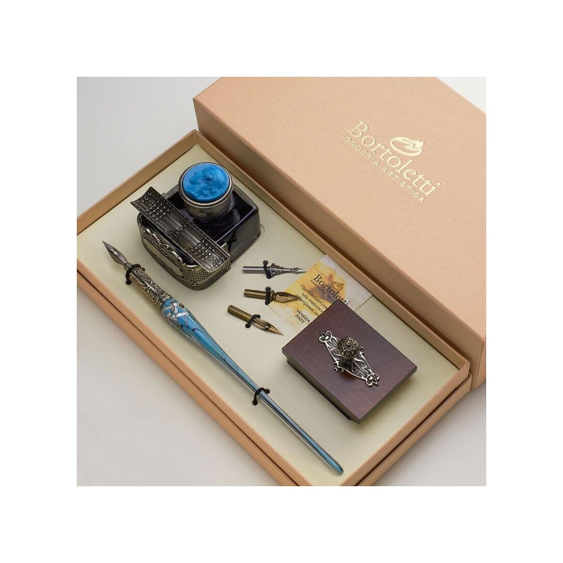 Une excellente façon de montrer votre bon goût. Qualité suinte avec ce magnifique ensemble stylo calligraphie plongeur, qui comprend un stylo en verre de Murano avec des flocons de bronze, encrier en verre avec de la pâte de verre et porte-stylo et d'un buvard d'encre. Fabriqué en Italie par Bortoletti Fonderia Artistica.