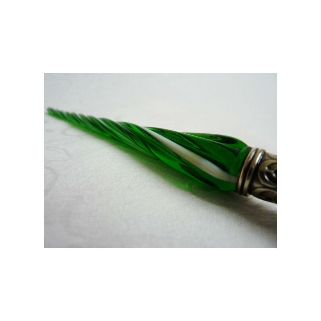 Un magnifiquement conçu, fini à la main, stylo calligraphie dip fixée pour ceux qui aiment le style et l'élégance de Venise. Comprend un arbre de verre torsadée avec un stylo en argent de nickel, trois plumes et une bouteille d'encre. Disponible dans une gamme de couleurs merveilleuses.