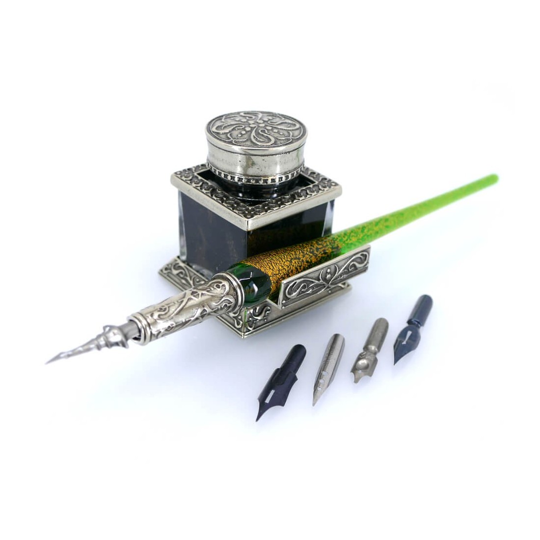 Un magnifiquement conçu, fini à la main, stylo calligraphie plongeur sertie de verre de Murano et feuille d'or. Comprend un verre et argent plaqué nickel, stylo bronze plongeur, quatre plumes et un encrier orné. Disponible dans une gamme de couleurs merveilleuses.