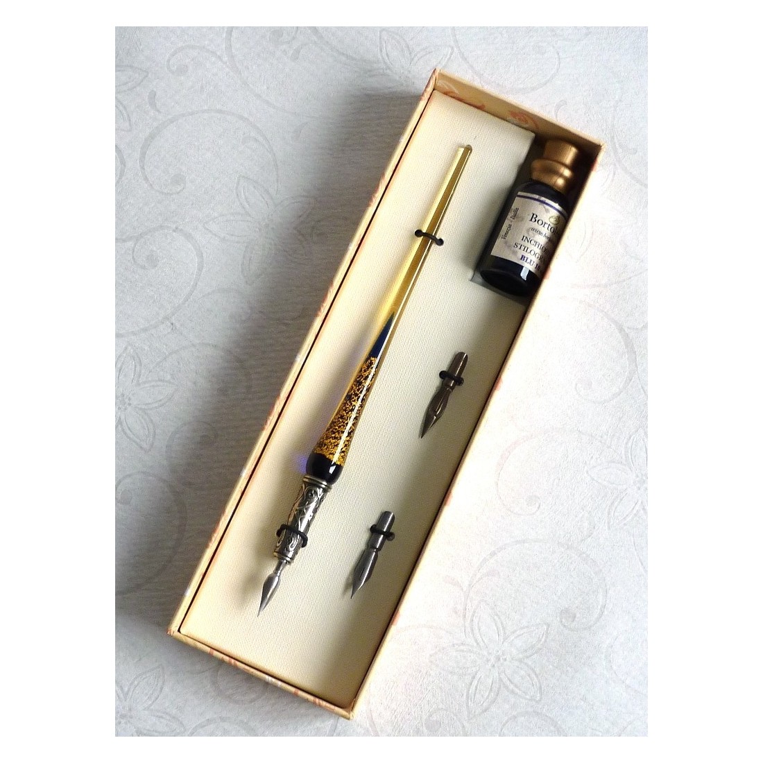 Stylo de calligraphie en verre feuille d'or, plumes et encre
