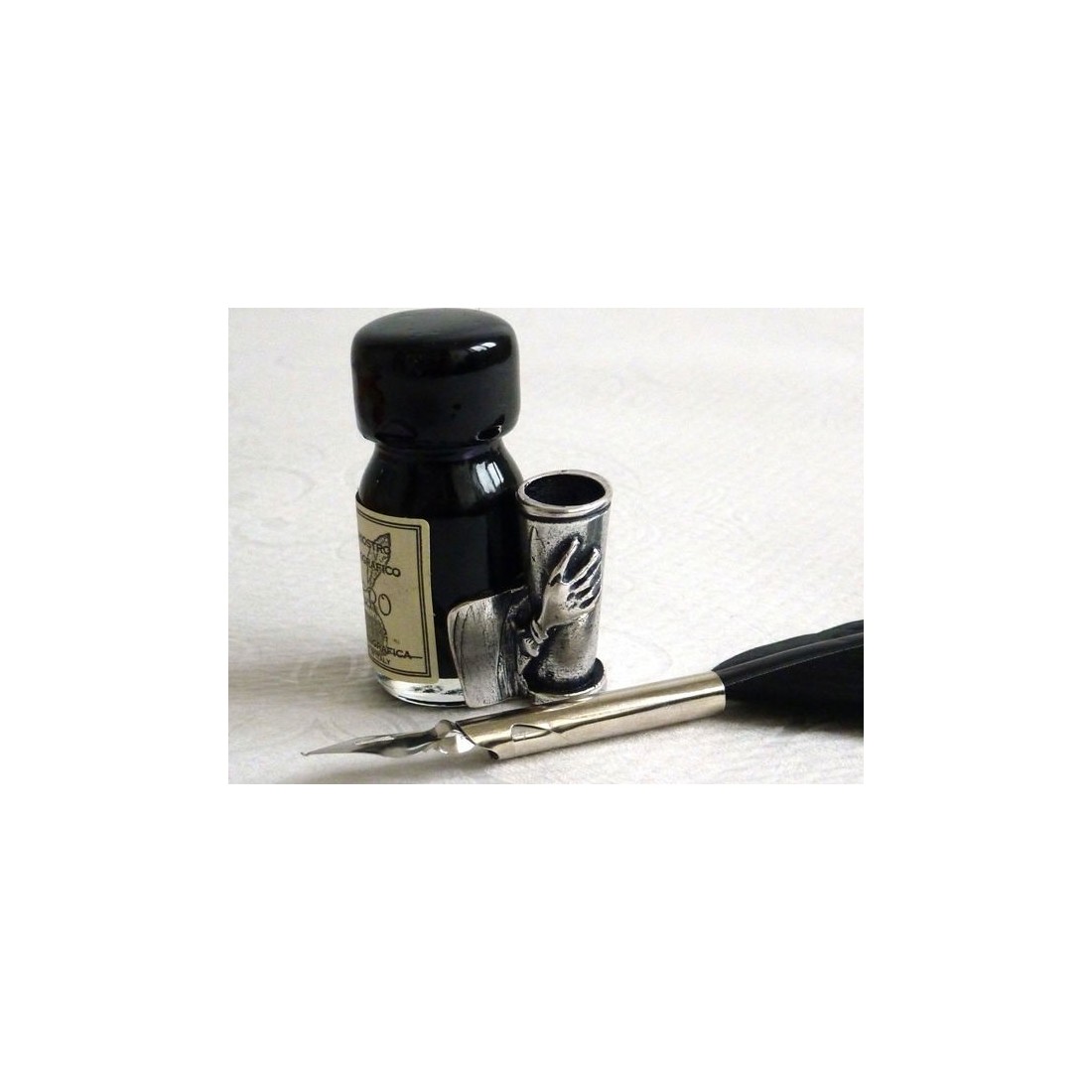 Questo meraviglioso set di penna e inchiostro per penna calligrafia in piuma d'oca renderà un regalo ideale per coloro che non vogliono il tipo più grande quill. Viene fornito completo di una bottiglia di inchiostro nero che incorpora un supporto per quill peltro. Made in Italy by La Kaligrafica.