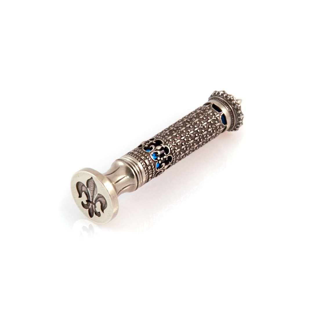 Il timbro sigillo di ceralacca Corona è un vero gioiello di design, realizzato in bronzo bianco cesellato a mano dai maestri gioiellieri Bortoletti. Si ispira ai gioielli della monarchia francese e del castello di Versailles e presenta un elemento Fleur-de-lys, che è stato l'emblema della regalità in Francia sin dal Medioevo.