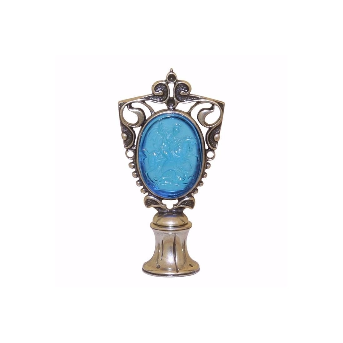 Set sigillo in ceralacca composto da sigillo in bronzo e cammeo in vetro raffigurante San Giorgio e il drago. Un sigillo, un bastoncino di ceralacca e un barattolo di crema di cera. La guarnizione e la maniglia sono rifinite in alpacca.