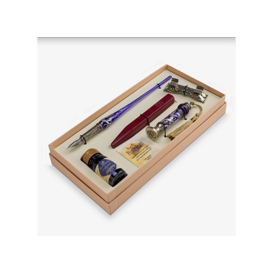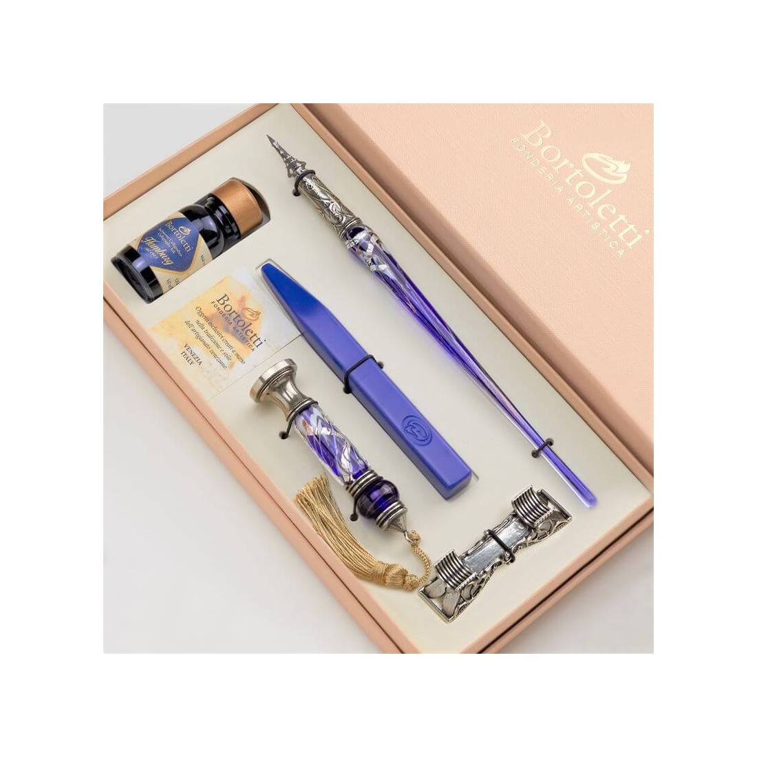 Il set per calligrafia Leopardi è uno dei fiori all'occhiello della collezione Bortoletti, ed è facile intuirne il motivo. La penna è realizzata in pregiato vetro di Murano e il portapenne è in bronzo bianco lavorato a mano. Anche il sigillo è realizzato in vetro di Murano e viene fornito con un'ampia varietà di lettere e simboli intercambiabili.