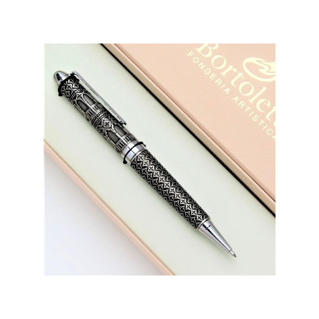 La fusione e la decorazione in bronzo bianco si incontrano in una penna dal design unico. Si abbina perfettamente con un portapenne. Ed è un altro dei fiori all'occhiello di Bortoletti.