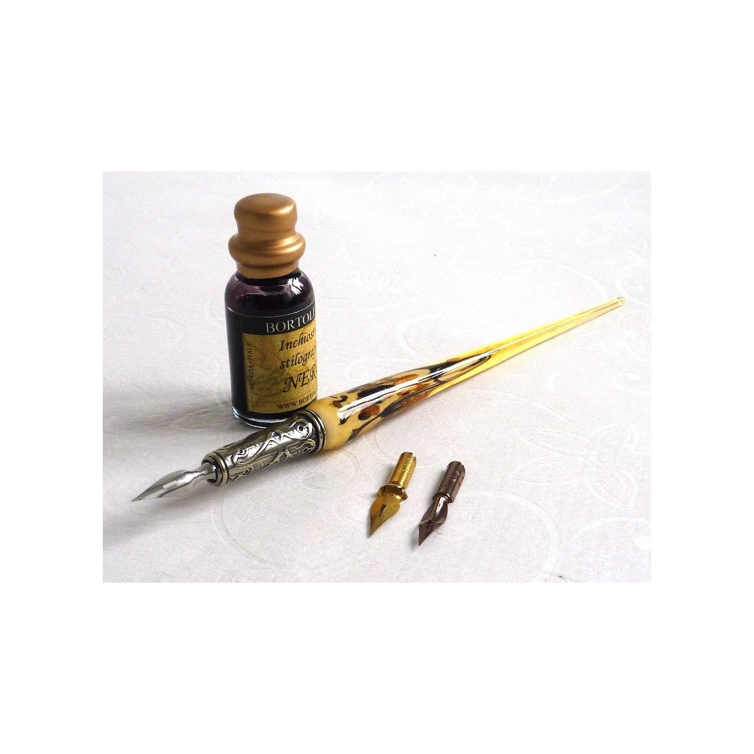 Foglia d'oro e set di penne di vetro. Un set di penne calligrafiche, finemente realizzato a mano, che comprende una penna di vetro di Murano con fiocchi di foglia d'oro, tre penne e una bottiglia di inchiostro. Disponibile in una gamma di colori meravigliosi. Made in Italy by Bortoletti Fonderia Artistica.