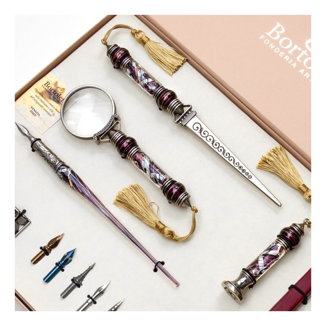 Questo elegante set da scrivania è perfetto per i calligrafi e per chiunque apprezzi gli oggetti belli. Include una penna calligrafica in vetro di Murano, un tagliacarte in bronzo bianco, una lente d'ingrandimento, un sigillo e ceralacca in vari colori. Tutti i pezzi sono realizzati con materiali di alta qualità e sono ben realizzati con attenzione ai dettagli.