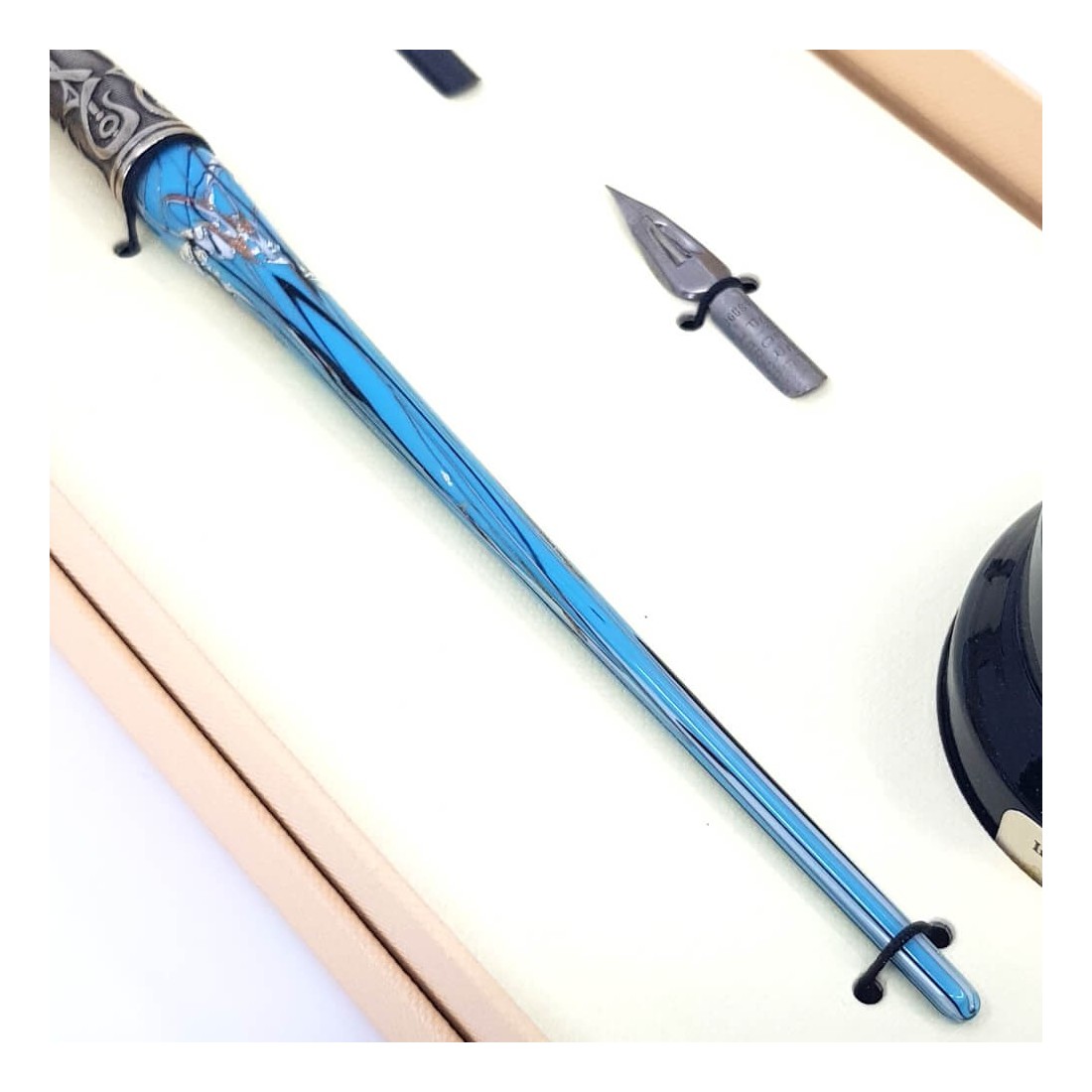 Un set di penne per calligrafia splendidamente realizzato, rifinito a mano, che comprende una penna in vetro di Murano con scaglie di foglia d'argento, tre pennini e una boccetta di inchiostro.