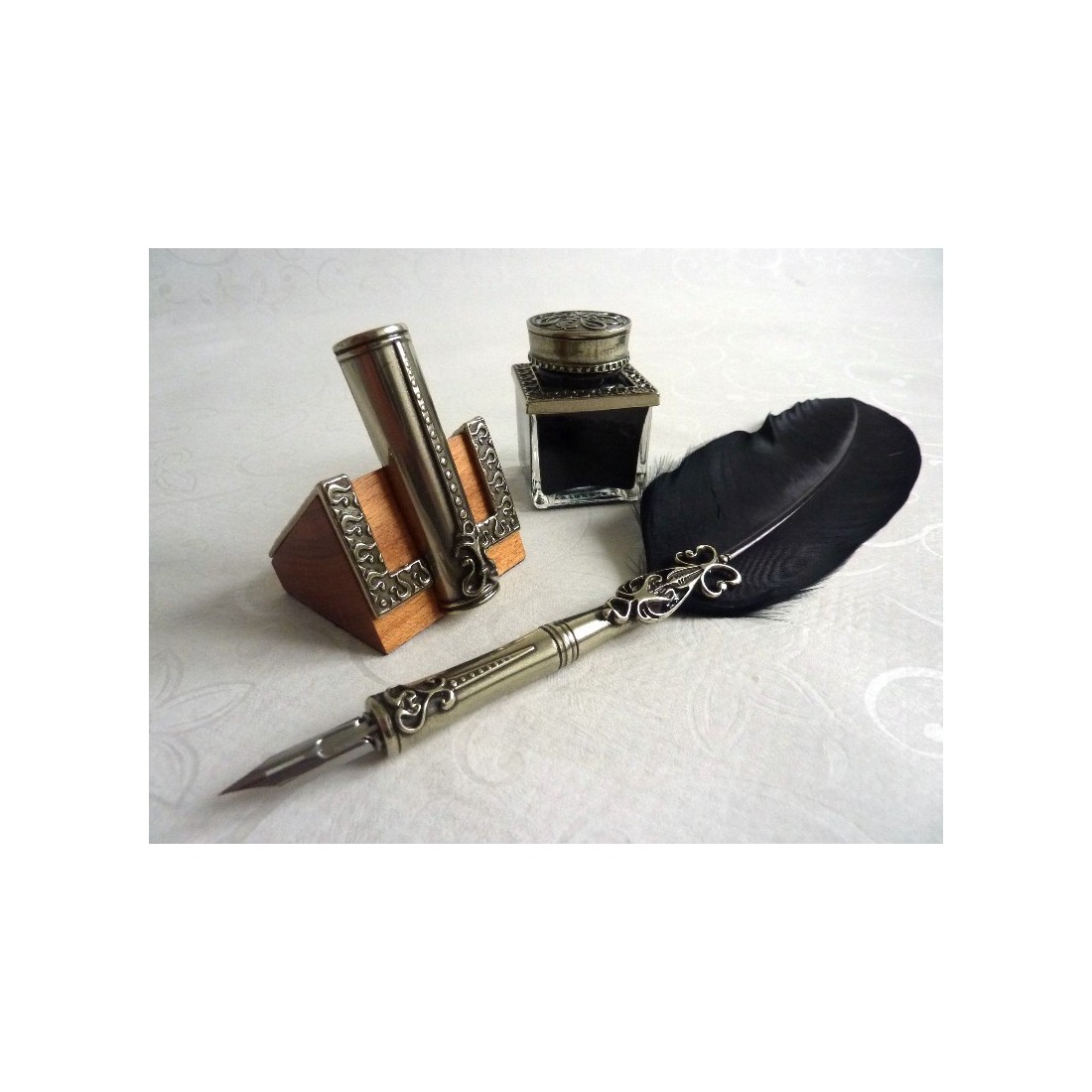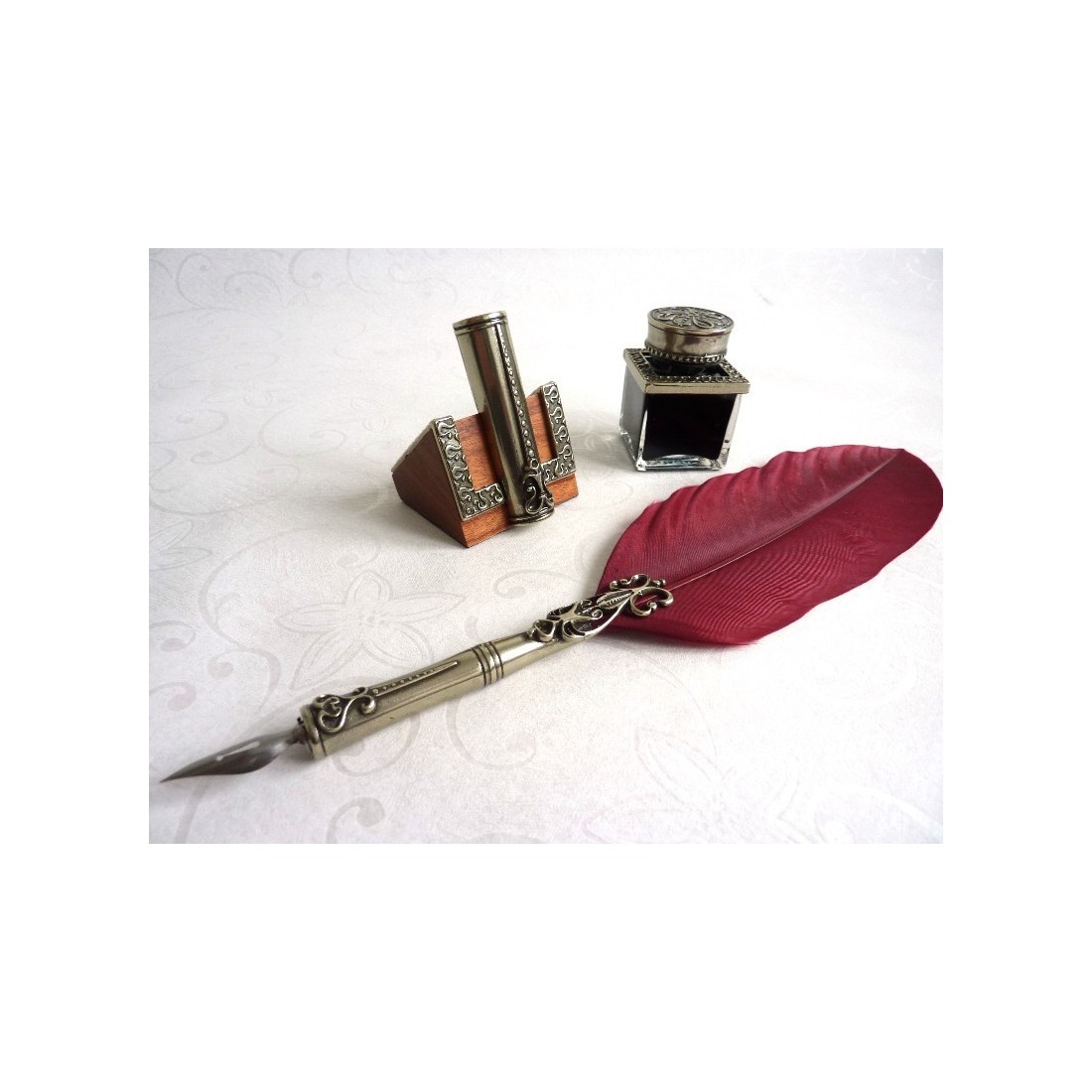 Penna piuma, calamaio e portapenne