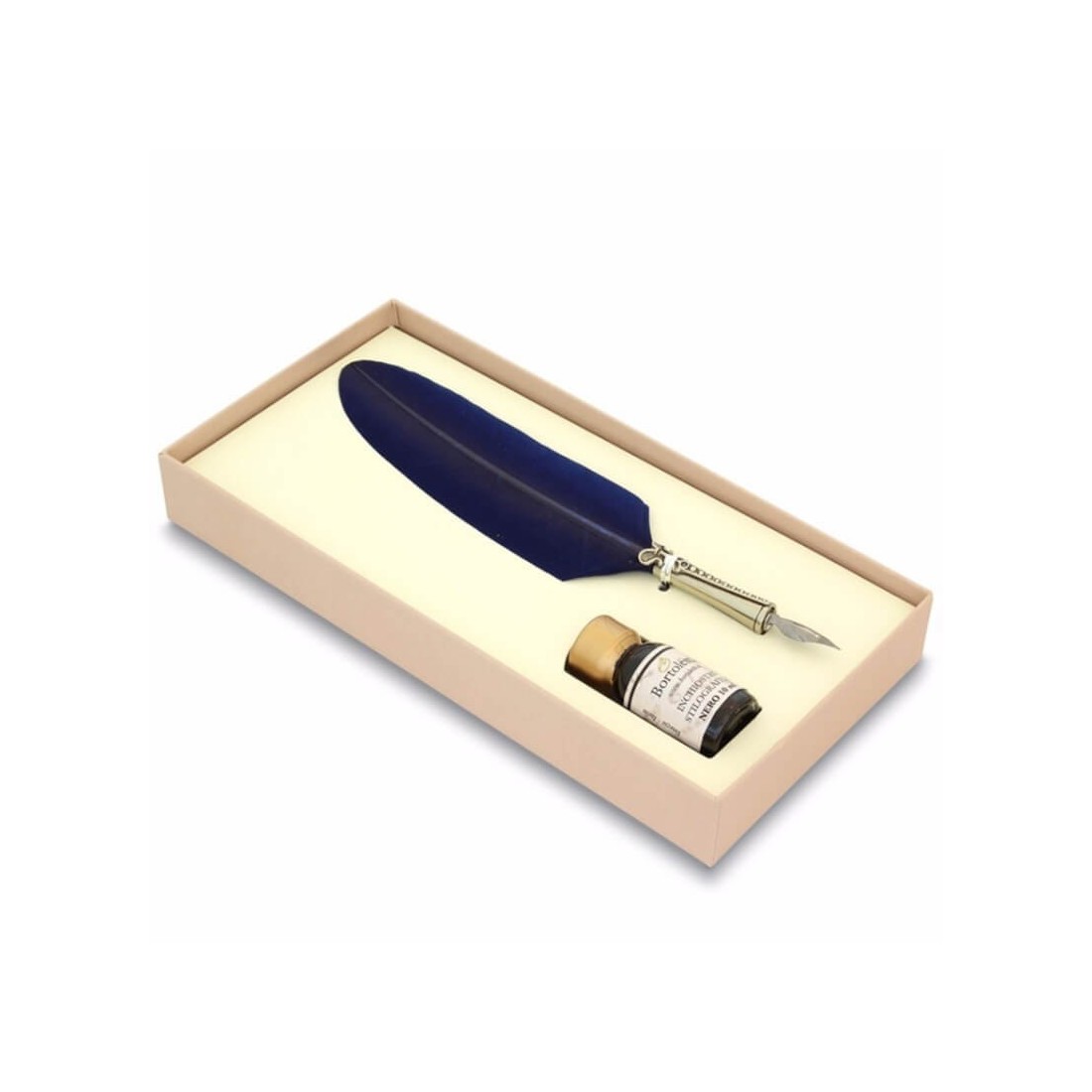 Penna e inchiostro della calligrafia piuma. Questo set comprende una penna a forma di calligrafia della penna d'oca con supporto in bronzo in argento nichelato e una bottiglia standard di inchiostro. Prodotto in Italia da Bortoletti Fonderia Artistica.