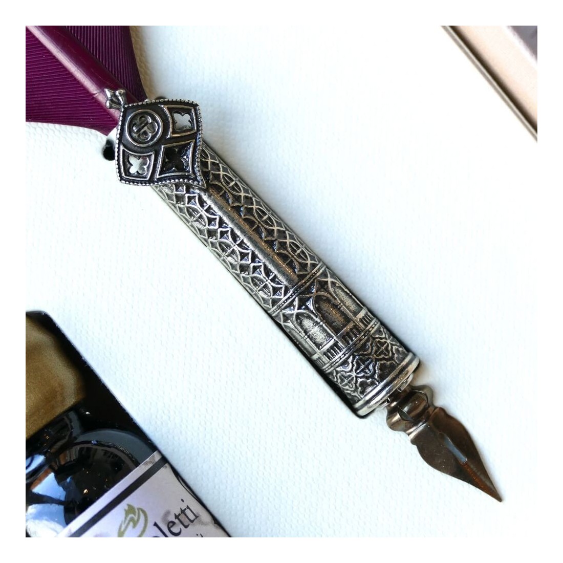 Penna e inchiostro della calligrafia piuma. Questo set comprende una penna a forma di calligrafia della penna d'oca con supporto in bronzo in argento nichelato e una bottiglia standard di inchiostro. Prodotto in Italia da Bortoletti Fonderia Artistica.