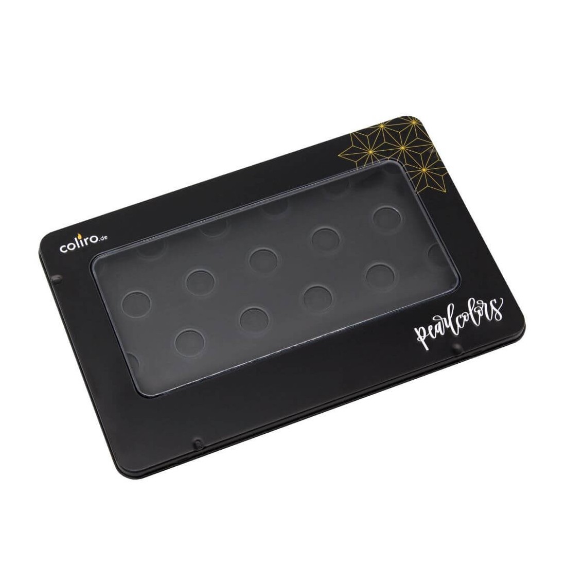 Ampia scatola di tavolozza in metallo nero per 22 Coliro Pearlcolors. Dispone di un coperchio chiaro e spazio per adesivi di nome, perfetto per organizzare collezioni più grandi.