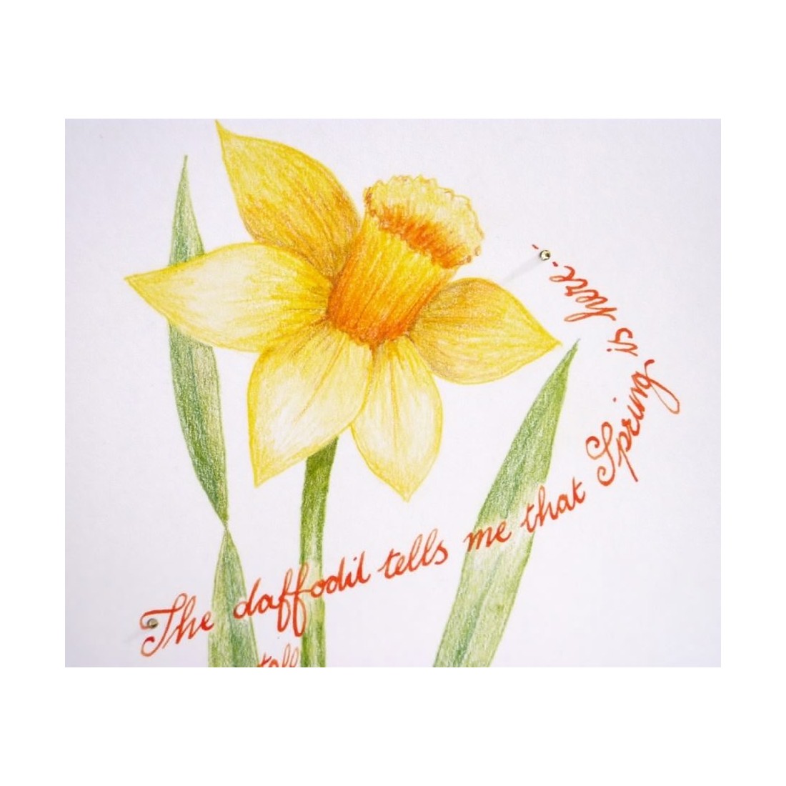 Lente narcis. Kalligrafie wenskaart. Een prachtige narcissenkaart met de hand getekend in potloden door Jane met een seizoensgebonden lentelijm in kalligrafie rond de bloem geschreven.