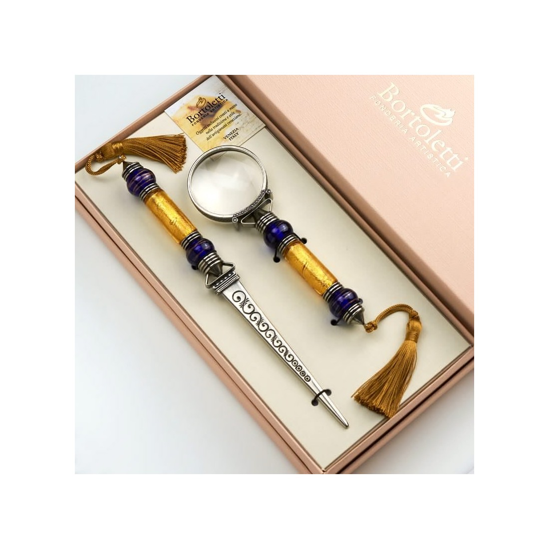 Liefde voor detail en verfijning van met de hand bewerkt bladgoud voor op je bureau. Gouden bureauaccessoires met kralen van Murano-glas verfraaid met bladgoud versmolten tot glas met met de hand afgewerkt wit bronzen detail. Een kans om uw goede smaak te onthullen. Deze set, bestaande uit een briefopener en lens, is uniek in zijn soort, het resultaat van het voortdurende onderzoek van Bortoletti en zijn meester-juweliers naar design.