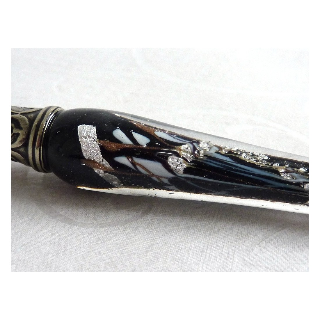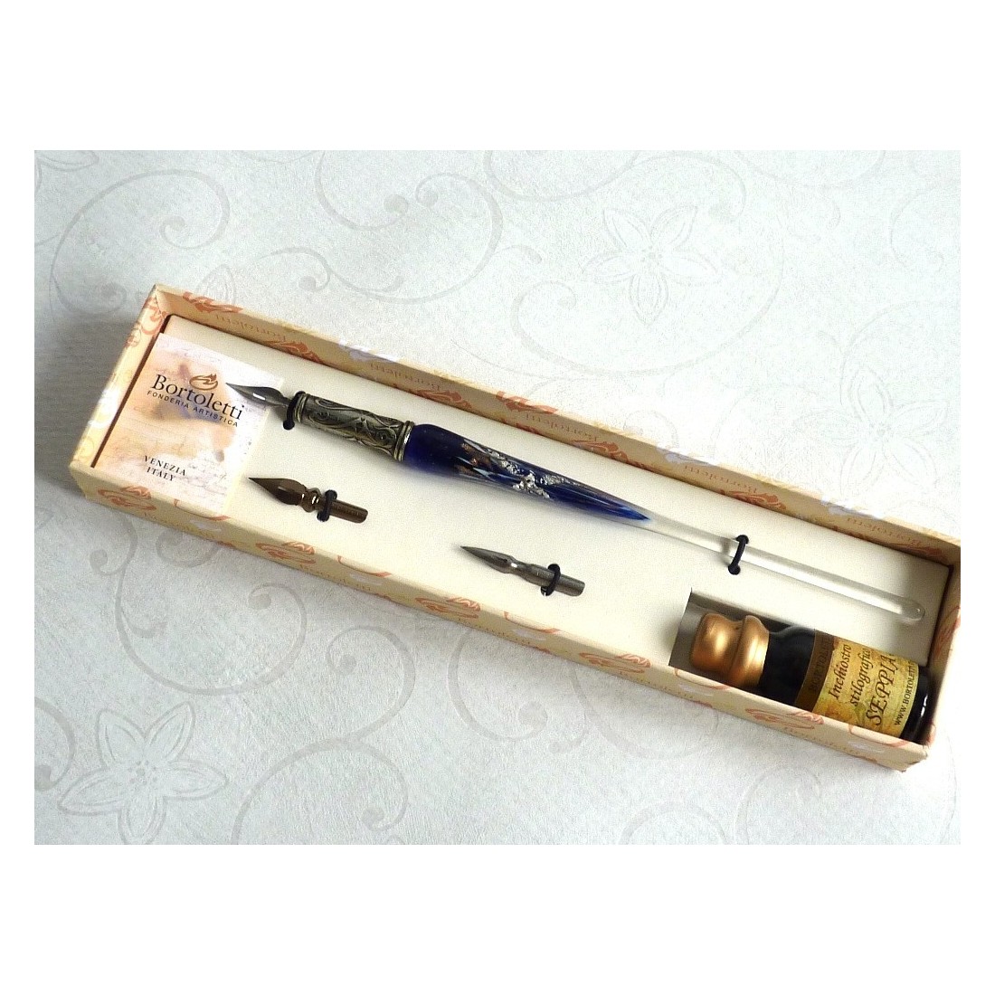 Zilveren blad en glas pen set. Een prachtig vormgegeven, met de hand afgewerkt, kalligrafie dip pen set, die een Murano glas pen met zilver blad vlokken, drie penpunten en een fles inkt bevat. Beschikbaar in een waaier van prachtige kleuren. Vervaardigd in Italië door Bortoletti Fonderia Artistica.