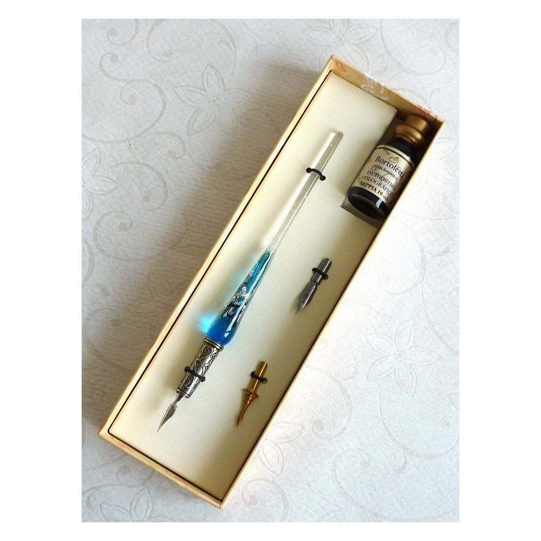Een prachtig vormgegeven, met de hand afgewerkt, kalligrafie dip pen set, die een Murano glas pen met zilver blad vlokken, drie penpunten en een fles inkt bevat. Verkrijgbaar in een waaier van prachtige kleuren.
