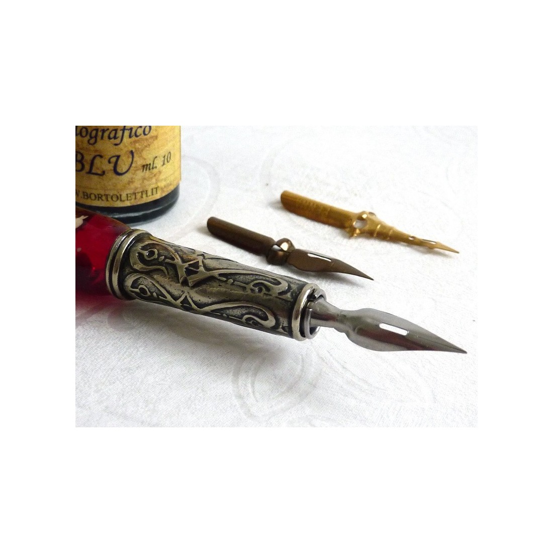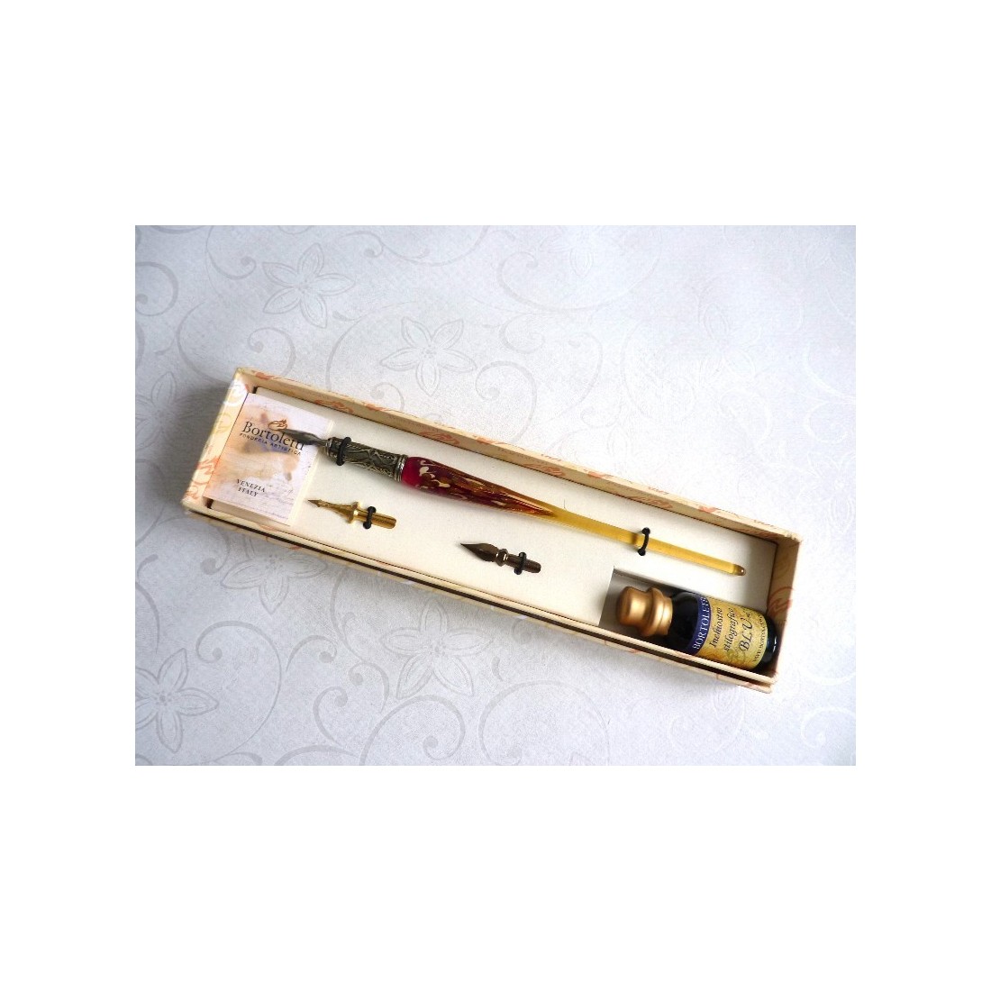 Bladgoud en glas pen set. Een prachtig vormgegeven, met de hand afgewerkt, kalligrafie dip pen set, die een Murano glas pen met bladgoud vlokken, drie penpunten en een fles inkt bevat. Beschikbaar in een waaier van prachtige kleuren. Vervaardigd in Italië door Bortoletti Fonderia Artistica.