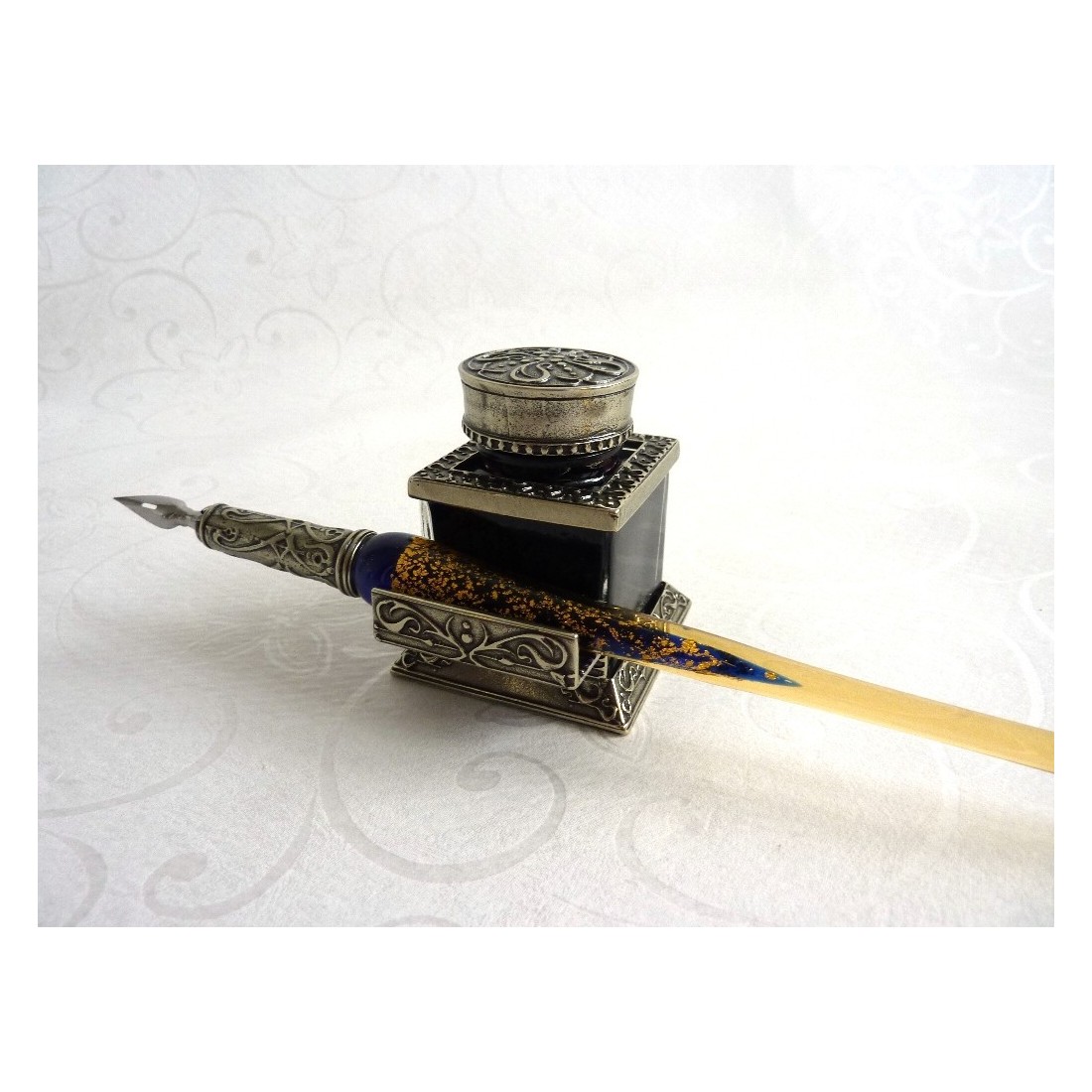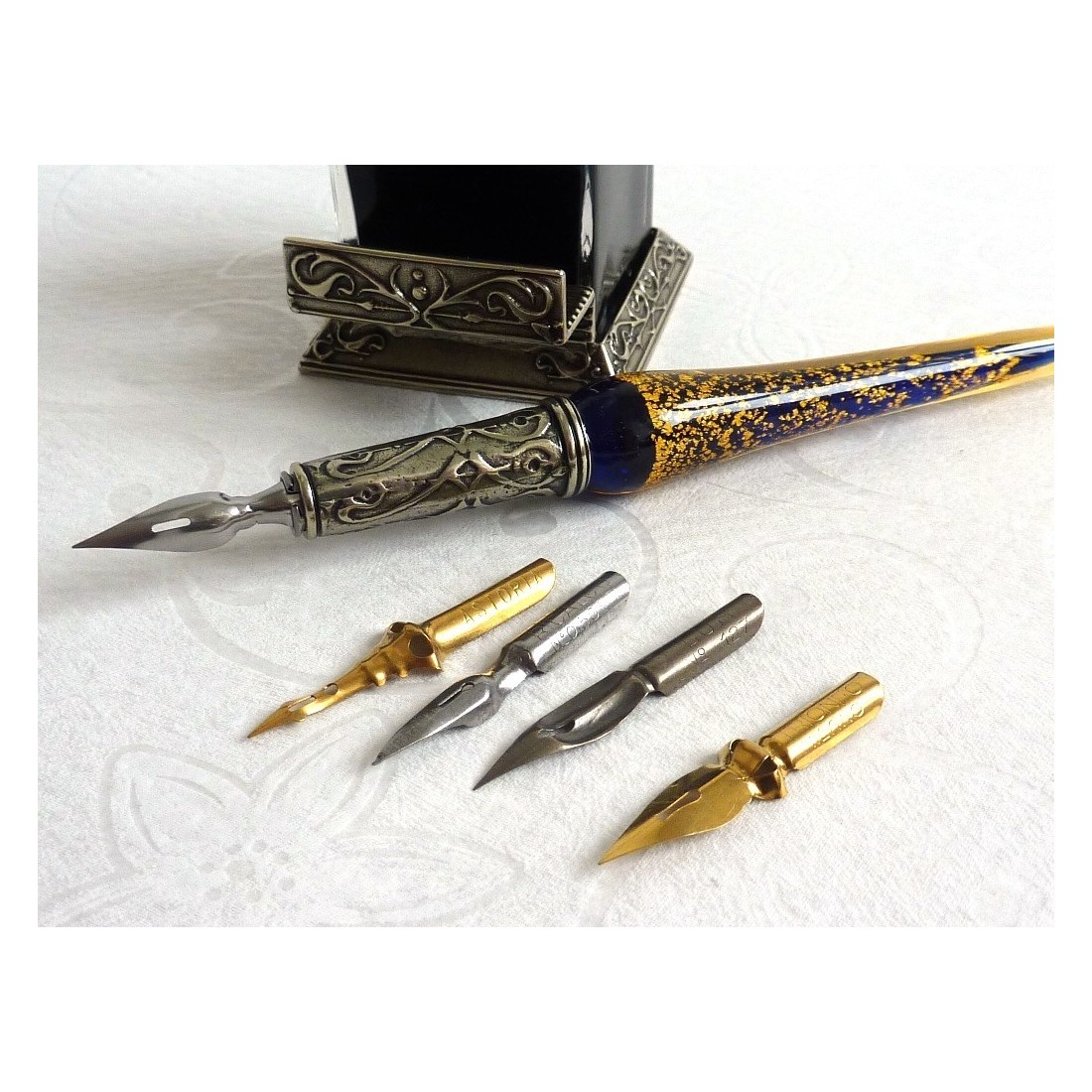 Een prachtig vormgegeven, met de hand afgewerkt, kalligrafie dip pen set met Murano glas en bladgoud. Bestaat uit een glas en nikkel verzilverd, brons dip pen, vier penpunten en een sierlijke inktpot. Verkrijgbaar in een waaier van prachtige kleuren.