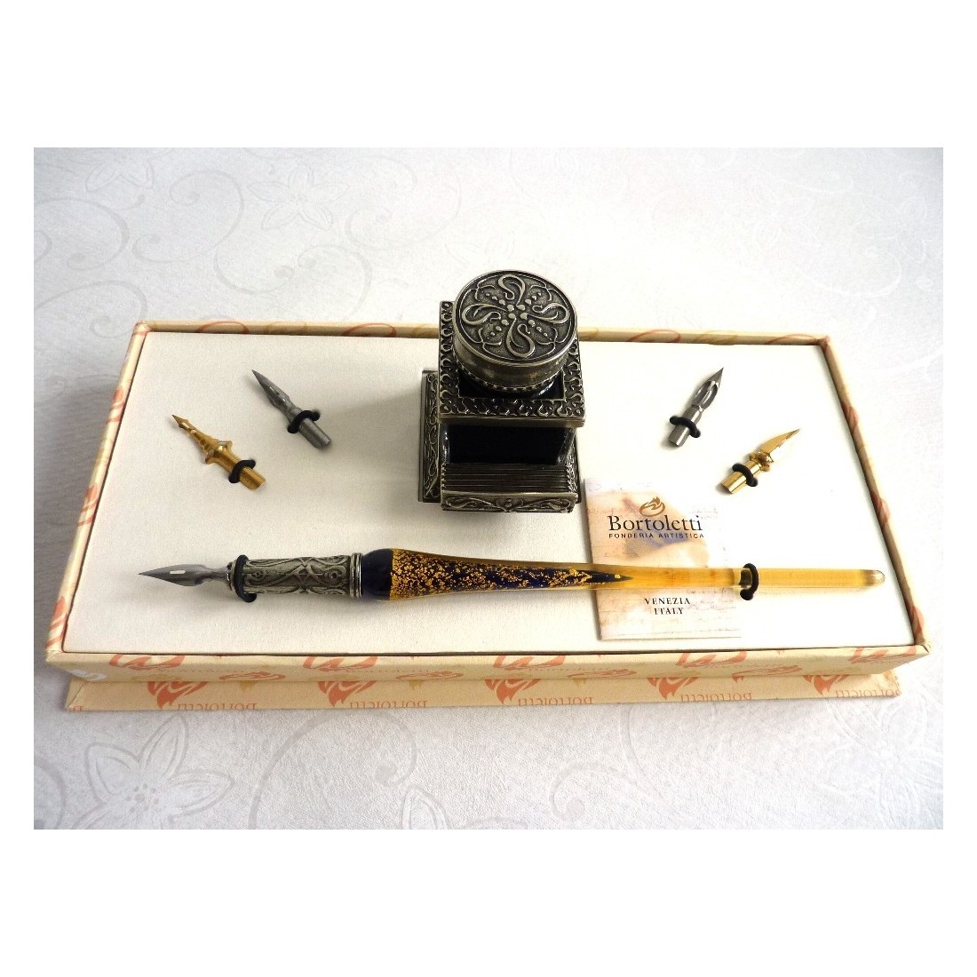 Murano-glas en bladgoud pen set. Een prachtig vormgegeven, met de hand afgewerkt, kalligrafie dip pen set. Bestaat uit een glazen en nikkel verzilverd brons kroontjespen, vier penpunten en een sierlijke inktpot. Beschikbaar in een waaier van kleuren. Vervaardigd in Italië door Bortoletti Fonderia Artistica.