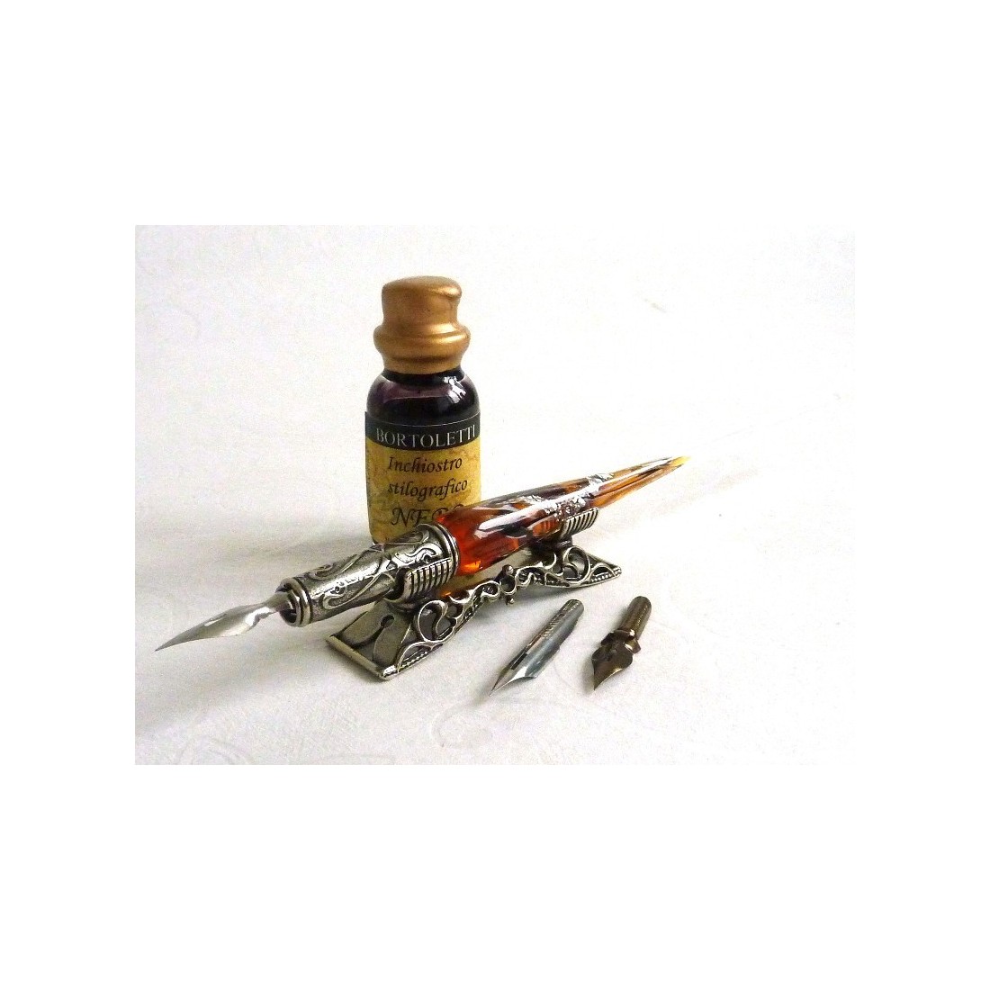 Zilveren blad en Glas dip pen. Een prachtig vormgegeven, met de hand afgewerkt, kalligrafie dip pen set met Murano glas en zilver blad. Bestaat uit een glazen en nikkel verzilverd, brons kroontjespen, drie penpunten en een sierlijke pen rust. Beschikbaar in een waaier van kleuren. Vervaardigd in Italië door Bortoletti Fonderia Artistica.