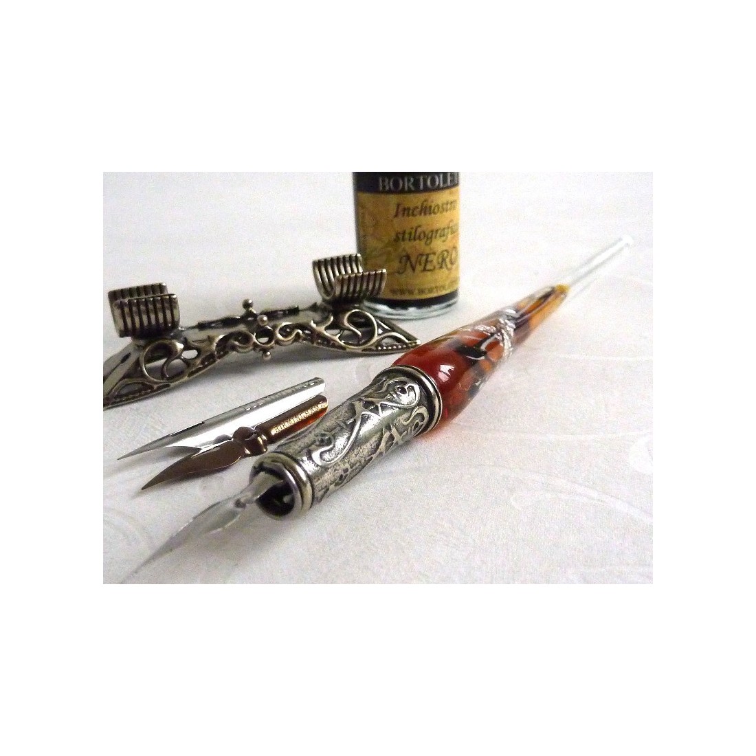 Kalligrafiepen van zilverbladig glas met penhouder