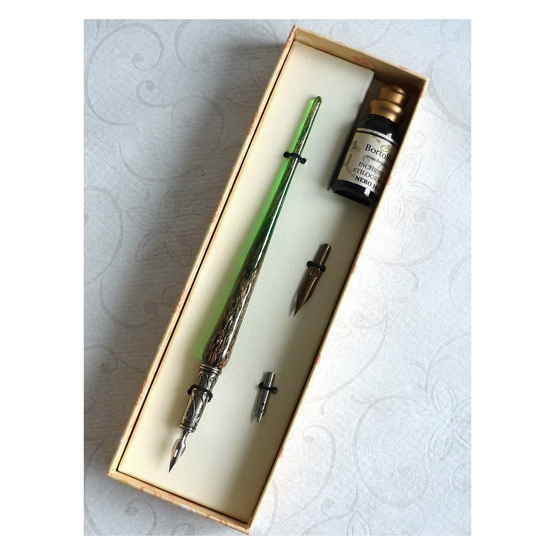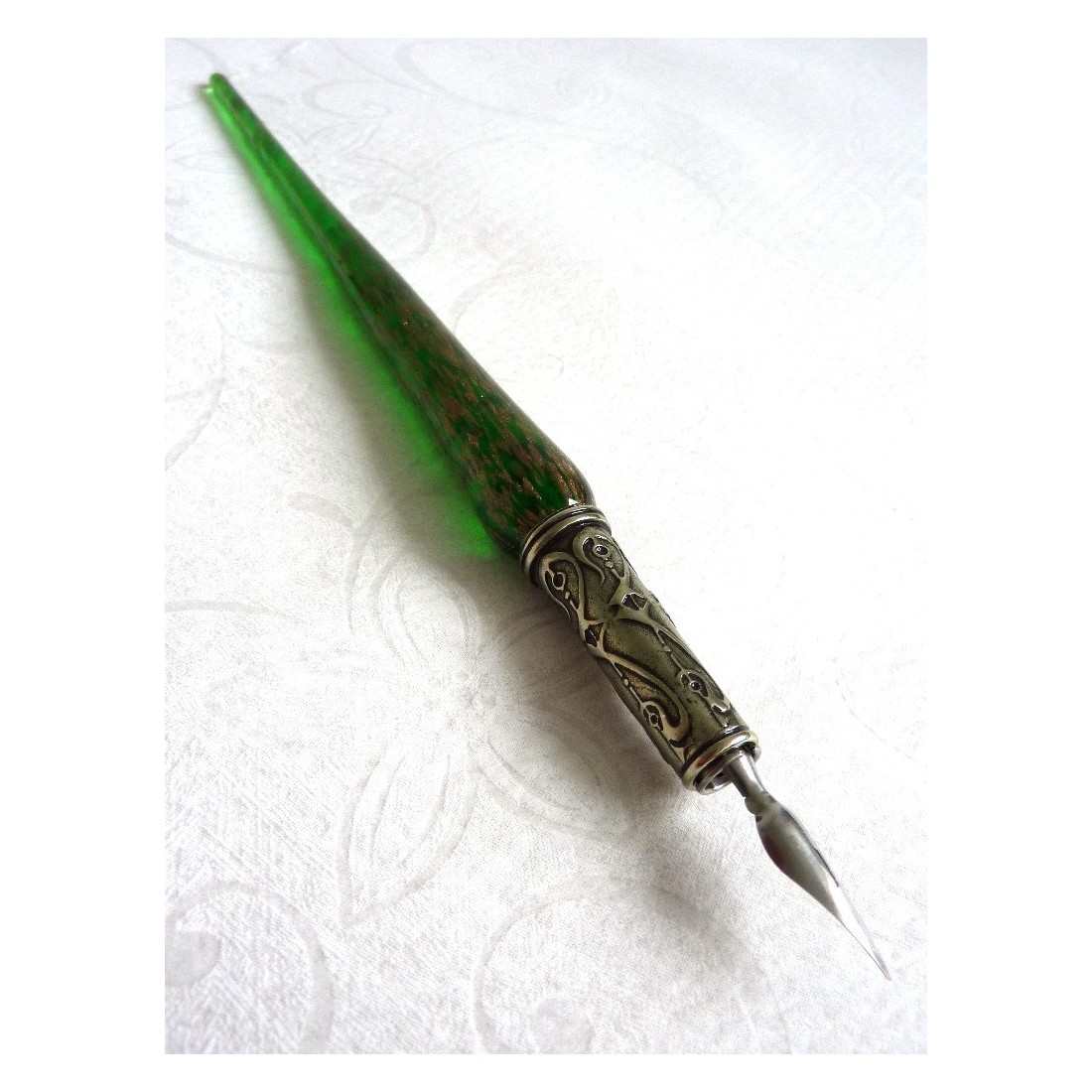 Koperen kristallen en glazen pennenset. Een prachtig vervaardigde, met de hand afgewerkte kalligrafieset met kalligrafiepen, bestaande uit een Murano Aventurijn-kwartsglaspen ingebed met koperkristallen. Ook inbegrepen zijn drie penpunten en een fles inkt. Verkrijgbaar in een reeks prachtige kleuren.