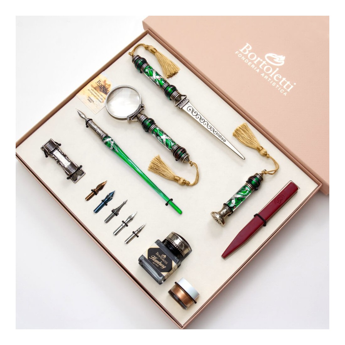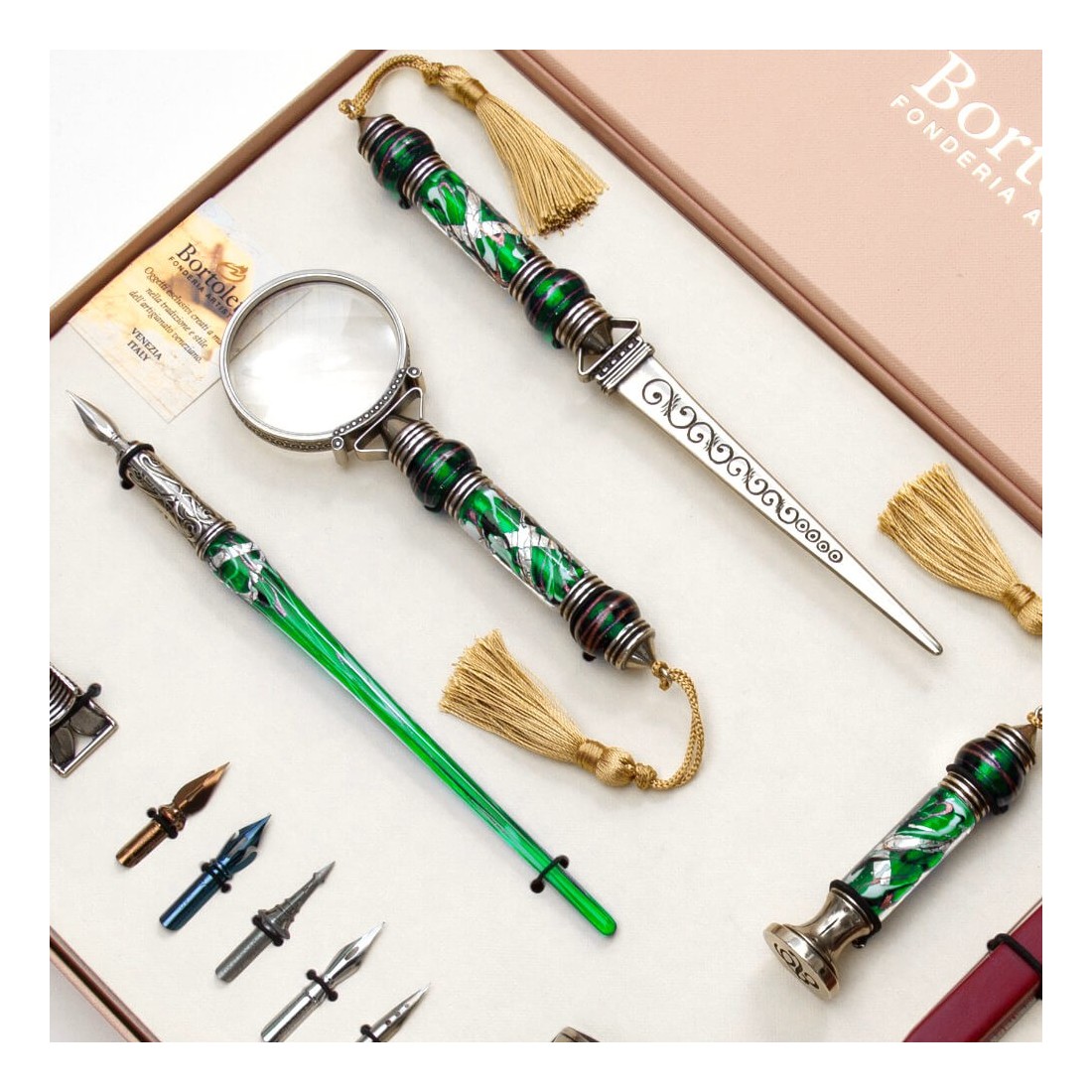 Deze elegante bureauset is perfect voor kalligrafen en iedereen die van mooie voorwerpen houdt. Het bevat een kalligrafiepen van Murano-glas, een witbronzen briefopener, een vergrootglas, een zegel en zegellak in verschillende kleuren. Alle stukken zijn gemaakt van hoogwaardige materialen en zijn goed gemaakt met aandacht voor detail.