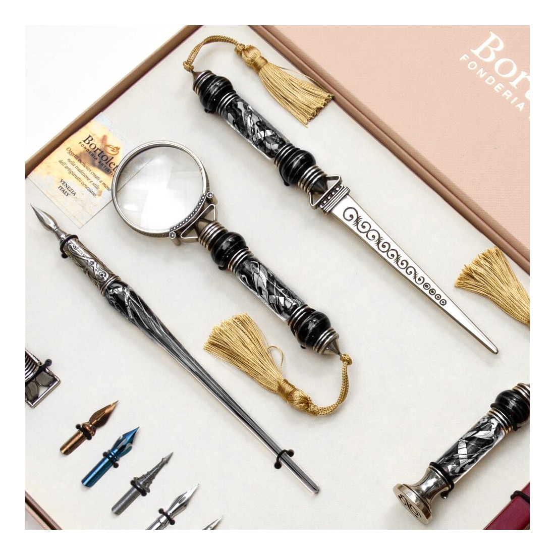 Deze elegante bureauset is perfect voor kalligrafen en iedereen die van mooie voorwerpen houdt. Het bevat een kalligrafiepen van Murano-glas, een witbronzen briefopener, een vergrootglas, een zegel en zegellak in verschillende kleuren. Alle stukken zijn gemaakt van hoogwaardige materialen en zijn goed gemaakt met aandacht voor detail.