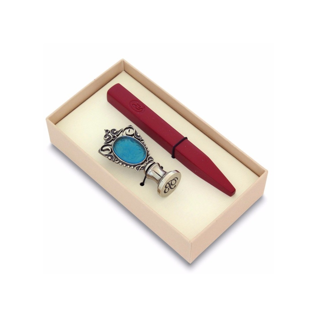 Lakzegelset bestaande uit een bronzen zegel en een glazen camee die Sint Joris en de draak voorstelt. Een zegel, een zegellakstokje en een pot wascrème. De zegel en het handvat zijn afgewerkt in nikkel-zilver.