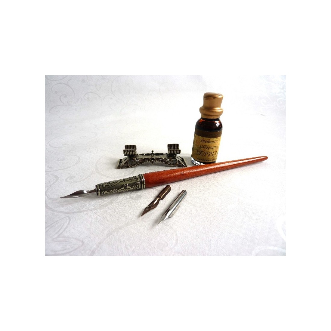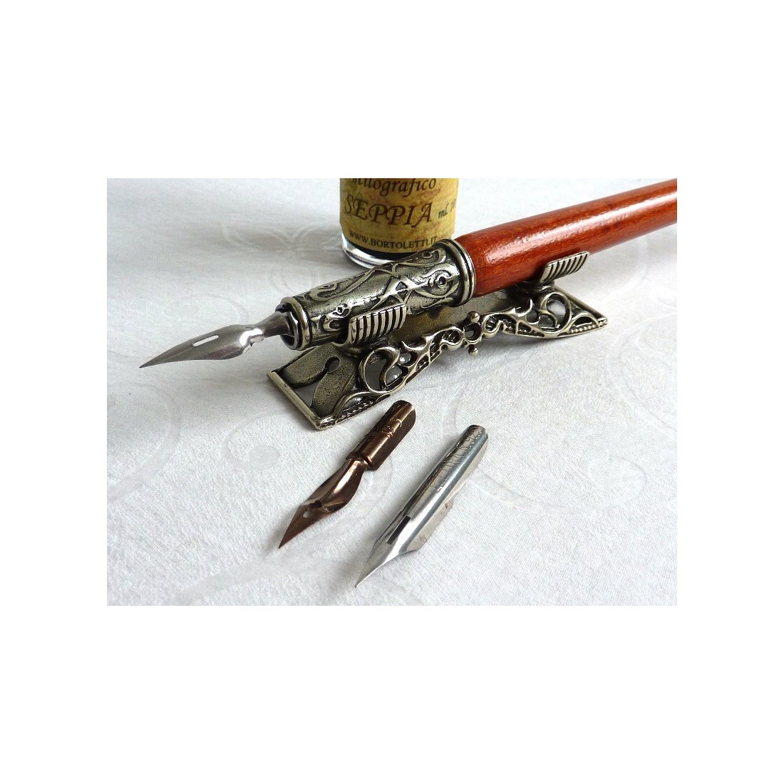 Houten pennenset met pen rust. Grote waarde en raffinement. Set bestaat uit een houten pen met brons en verguld in nikkel zilver, pen rust in nikkel zilver, fles inkt en drie antieke penpunten. Vervaardigd in Italië door Bortoletti Fonderia Artistica.